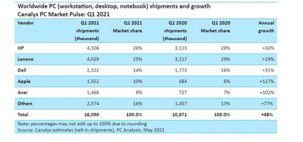 Η Dell, η Apple και η Acer συμπλήρωσαν τις πρώτες πέντε θέσεις της ίδιας κατάταξης, με μερίδια αγοράς 14%, 10% και 9% αντίστοιχα.