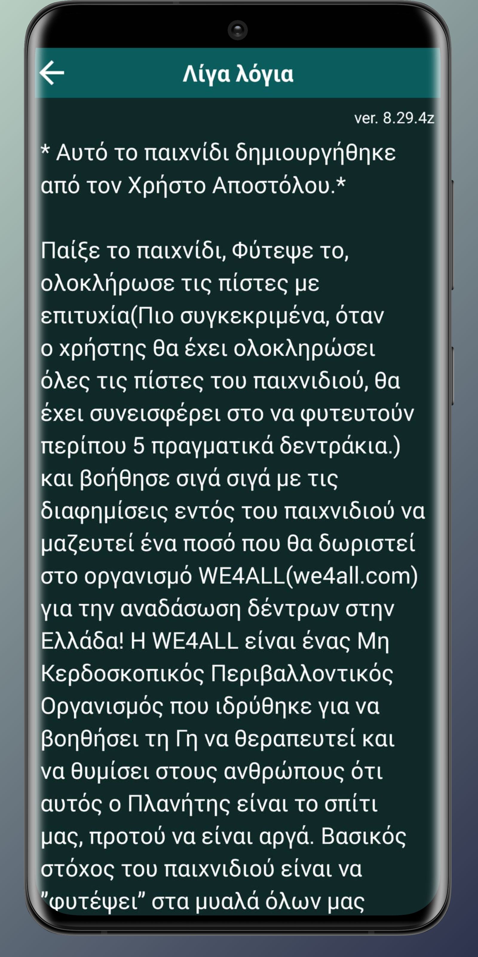 Πρόκειται για ένα παιχνίδι γνώσεων, που οι ενδιαφερόμενοι μπορούν να βρουν στο Google PlayStore είτε αναζητώντας το με το όνομά του είτε απευθείας στο link. Σύμφωνα με τον δημιουργό του, προσφέρει γενικές γνώσεις στους χρήστες σε σχέση με το περιβάλλον και όταν ο χρήστης θα έχει ολοκληρώσει όλες τις πίστες τους παιχνιδιού, θα έχει συνεισφέρει στο να φυτευτούν περίπου 5 αληθινά δεντράκια.