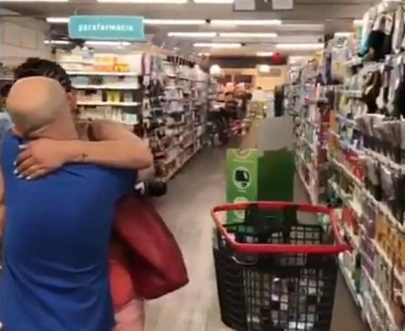 Ακούγονται κατόπιν τα χειροκροτήματα πελατών και υπαλλήλων ενώ η εικόνα μετατοπίζεται στον διάδρομο με τα καθαριστικά, όπου η νεαρή γυναίκα, η Τιτσιάνα Φαμάο, πιάνεται από το καρότσι με τα ψώνια για να μην πέσει κάτω από την έκπληξη.
