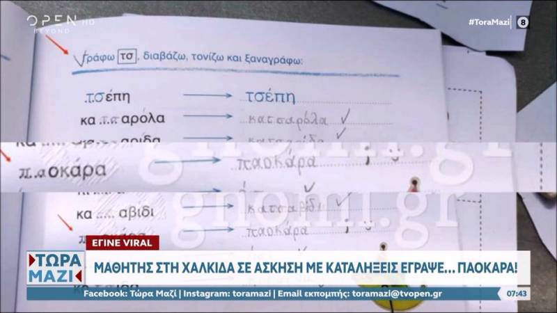 Ο 6χρονος είχε να λύσει μια άσκηση της γλώσσας που ζητούσε με το δίφθογγο «τα’, να συνθέσει τις λέξεις-κλειδιά, να τις τονίσει και να τις ξαναγράψει. Και εκείνος στην λέξη «οκαρα» ...έγραψε ΠΑΟΚαρα αντί για ...τσόκαρα.