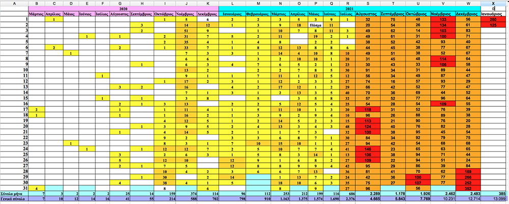 Αναλυτικά τα κρούσματα στην Μεσσηνία από την αρχή της πανδημίας μέχρι χθες, ανά ημέρα και μήνα, παρουσιάζονται στον πίνακα.