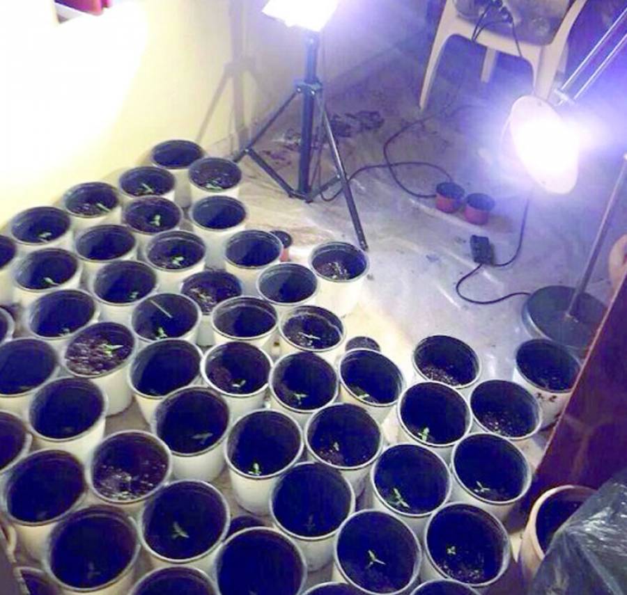 Μέσα σε ένα δωμάτιο, ο συλληφθείς είχε φτιάξει σε ένα χώρο 4 τ.μ. τις ιδανικές συνθήκες, με σταθερή θέρμανση και τεχνητό φως, ώστε να μεγαλώσουν τα 67 φυτά χασίς ύψους 2 έως 17 εκατοστά. Συγκεκριμένα, κράταγε ζεστό το χώρο με ένα αερόθερμο και παρείχε φως με ένα φωτιστικό δαπέδου και δύο προβολείς: ο ένας, υψηλής ισχύος, ήταν στερεωμένος σε τρίποδο, και ο άλλος προσαρμοσμένος πάνω σε μια μεταλλική σκάλα.