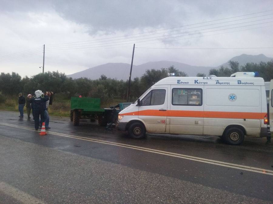 Γύρω στις 3:30 σήμερα το μεσημέρι ΙΧ αυτοκίνητο τράκαρε με τρακτέρ και καρφώθηκε στο πίσω μέρος του δεύτερου οχήματος. Αποτέλεσμα της σύγκρουσης ήταν ο θανάσιμος τραυματισμός του οδηγού του ΙΧ. Το τροχαίο έγινε στο δρόμο Κυπαρισσίας - Φιλιατρών στο ύψος της Τερψιθέας. Και τα δύο οχήματα είχαν κατεύθυνση προς Κυπαρισσία.