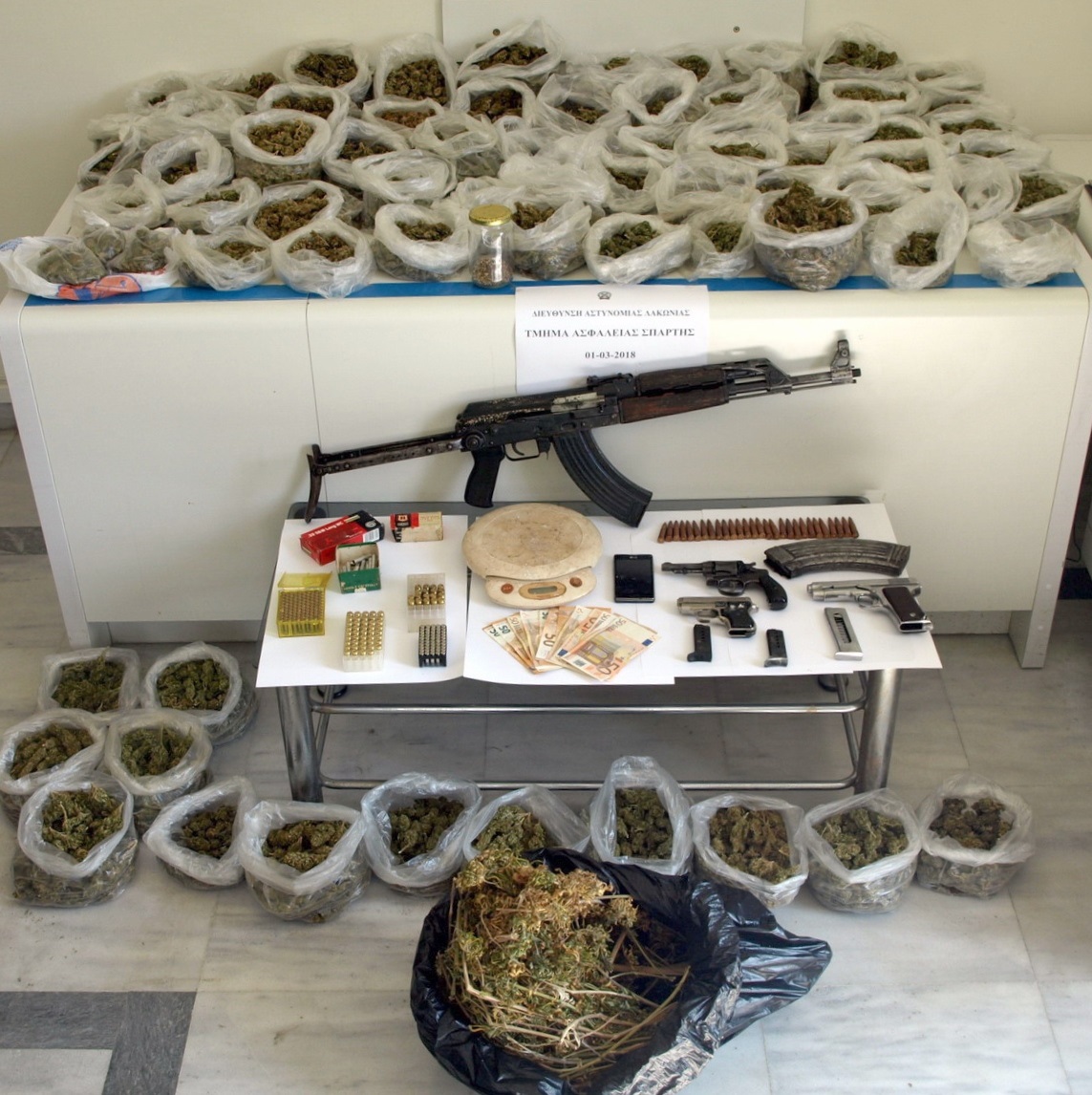 Αρχικά σε έρευνα, που του έκαναν αστυνομικοί της Ασφάλειας Σπάρτης μετά από σχετικές πληροφορίες εντόπισαν ότι είχε στην κατοχή του 73,5 γραμμάρια χασίς. Ακολούθησε έρευνα στο σπίτι του και εκεί προέκυψε ότι κατείχε: