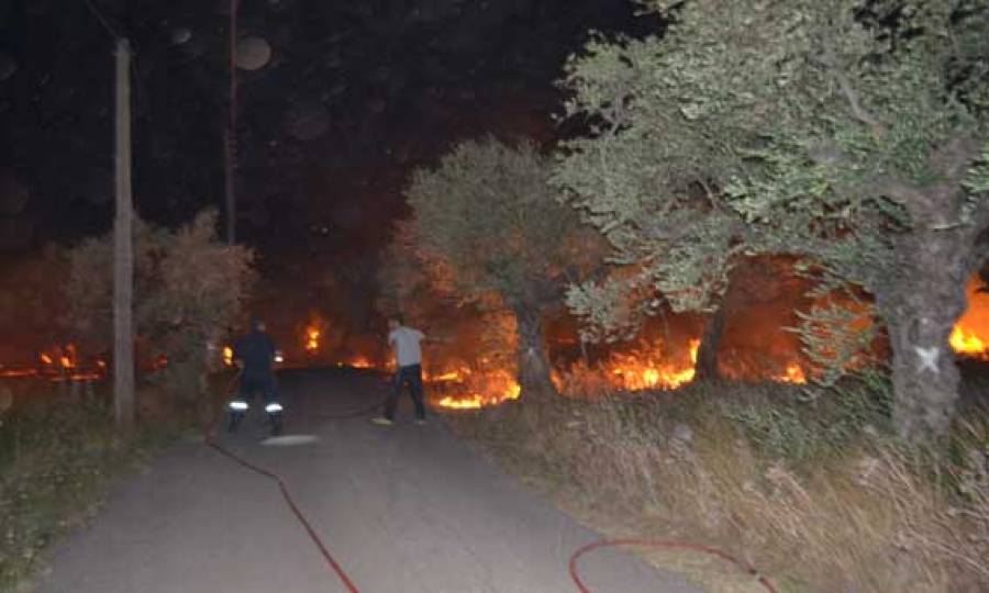 Η φωτιά έχει φτάσει μέχρι τη θάλασσα και στο διάβα της έχει κάψει πολλές ελιές ενώ είναι άγνωστο αν έχουν καεί σπίτια ή άλλα κτήρια