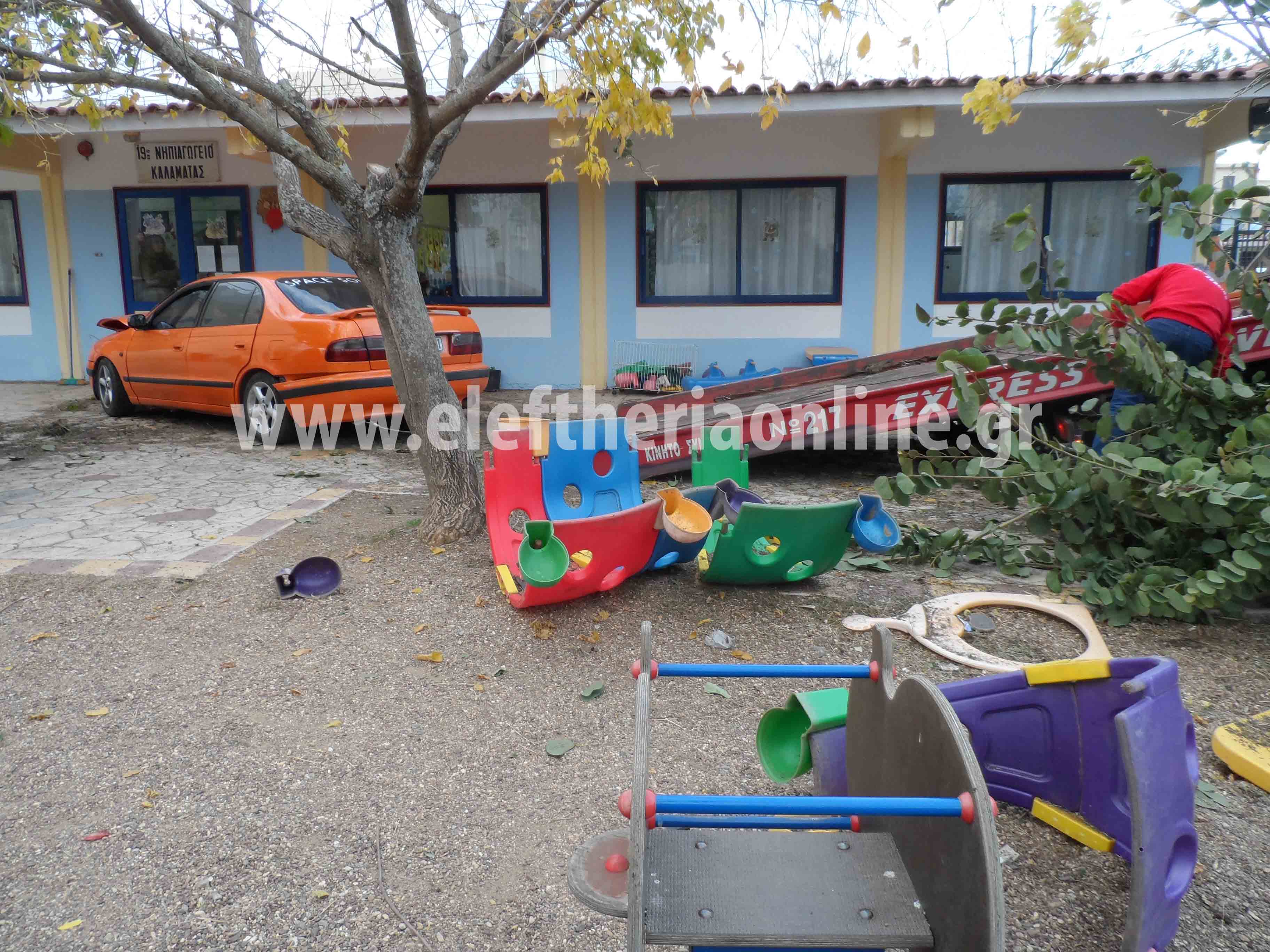 Ενα αυτοκίνητο κάτω από αδιευκρίνιστες συνθήκες "μπούκαρε" στο προαύλιο του σχολείου στην οδό Λακωνικής 10 λεπτά πριν προσέλθουν οι μαθητές. Σύμφωνα με μαρτυρίες πάντως στο αυτοκίνητο επέβαιναν 4 νεαροί και κατευθύνονταν από Βέργα προς Καλαμάτα. Ο οδηγός έχασε τον έλεγχο και αφού πρώτα χτύπησε στη μάντρα του νηπιαγωγείου, "μπούκαρε" στο προαύλιο περνώντας ανάμεσα από αρκετά δέντρα και καταστρέφοντας την παιδική χαρά. Η "τρελή" πορεία του αυτοκινήτου σταμάτησε μπροστά από την πόρτα του σχολείου. Ευτυχώς σύμφωνα με τις πρώτες πληροφορίες δεν υπήρξε κάποιος τραυματισμός.
