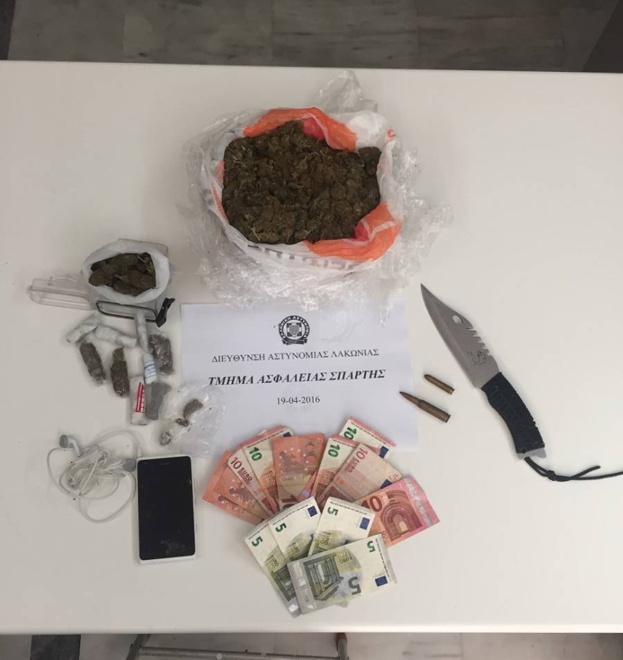 Ειδικότερα σήμερα το μεσημέρι στη Σπάρτη, οι αστυνομικοί αξιοποιώντας πληροφορία που είχαν, οργάνωσαν αστυνομική επιχείρηση και πραγματοποίησαν έρευνα στο σπίτι του 27χρονου, όπου βρήκαν συνολικά και κατάσχεσαν, ποσότητα χασίς βάρους 493,6 γραμμαρίων, ένα μαχαίρι με μήκος λάμας 16 εκατοστών, δύο φυσίγγια, ένα κινητό τηλέφωνο και το χρηματικό ποσό των 110 ευρώ.