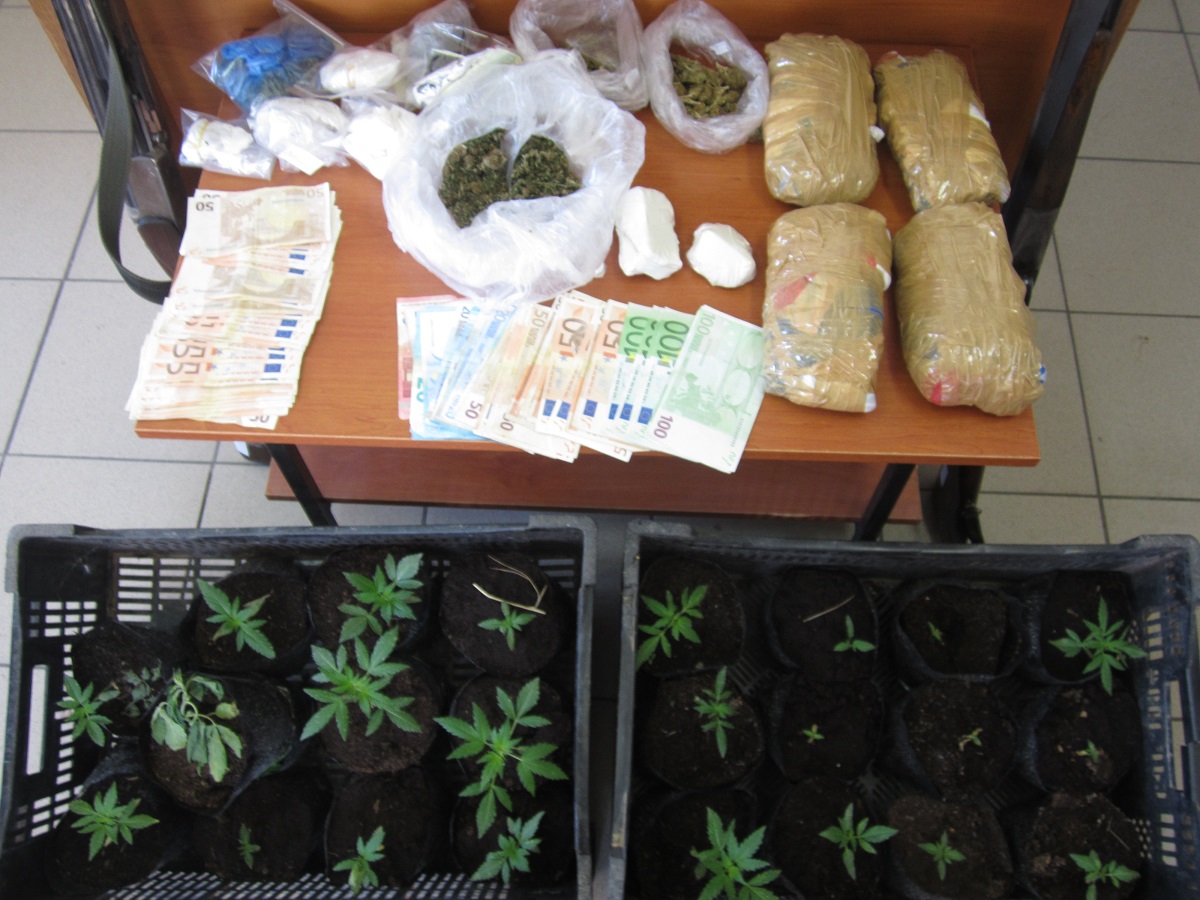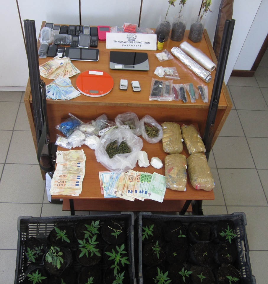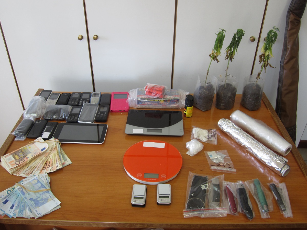 27 δενδρύλλια χασίς, ποσότητα κοκαΐνης βάρους 158,2 γραμμαρίων, 3 ναρκωτικά χάπια, το χρηματικό ποσό των 6.240 ευρώ, 5 ζυγαριές ακριβείας, 3 κυνηγετικά όπλα, 10 φυσίγγια, 7 σουγιάδες, σπρέι πιπεριού, 39 κροτίδες, 4 οχήματα και πλήθος κινητών τηλεφώνων και καρτών sim.