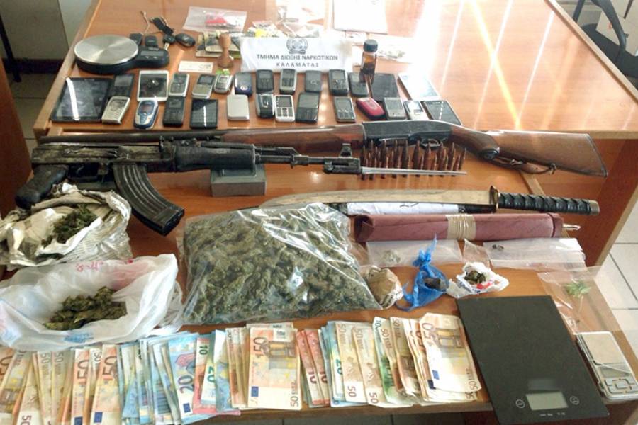 Οπως κατέθεσαν οι αστυνομικοί χθες στη δίκη, όλα ξεκίνησαν από μια πληροφορία την οποία η Δίωξη Ναρκωτικών Καλαμάτας έκρινε ως αξιόπιστη, ότι ο φερόμενος ως αρχηγός και ένας ακόμα κατηγορούμενος ως μέλος θα καλλιεργούσαν φυτεία χασίς μαζί με κάποιους Αλβανούς. Ετσι ξεκίνησε πέρυσι στα τέλη Φεβρουαρίου η παρακολούθηση 4 τηλεφώνων Καλαματιανών και μετέπειτα κατηγορουμένων, για τους οποίους υπήρχαν υποψίες πως διακινούσαν ναρκωτικά. Στις έρευνες που έγιναν στα σπίτια των κατηγορουμένων ως μελών, οι αστυνομικοί κατέθεσαν ότι βρέθηκαν μικροποσότητες ναρκωτικών και διάφορα χρηματικά ποσά, ενώ στο σπίτι του φερόμενου ως αρχηγού βρέθηκαν επίσης ποσότητες ναρκωτικών διαχωρισμένες και ένα Καλάσνικοφ με το γεμιστήρα του θαμμένο κοντά στην αυλή του σπιτιού του (εκτός όμως του περιφραγμένου οικοπέδου του) μέσα σε ένα σακίδιο. Επίσης κατά τη διάρκεια των αστυνομικών ερευνών, που έγιναν σε σπίτια, αποθήκες, αγροκτήματα, αυτοκίνητα και εξωτερικούς χώρους, βρέθηκαν συνολικά και κατασχέθηκαν: Ενα πολεμικό όπλο Καλάσνικοφ με ξιφολόγχη και γεμιστήρα με 30 σφαίρες. Ποσότητα χασίς βάρους 627,9 γραμμαρίων. Ποσότητα ηρωίνης βάρους 13,6 γραμμαρίων. Ποσότητα μεθαδόνης βάρους 89,6 γραμμαρίων. 2 δενδρύλλια χασίς. 60 ναρκωτικά χάπια. Κυνηγετικό όπλο και σπάθα. Το χρηματικό ποσό των 2.720 ευρώ. 3 ζυγαριές ακριβείας. Ποσότητα πυρίτιδας βάρους 18,6 γραμμάριων. Αυτοσχέδιο βεγγαλικό (σαΐτα). Στρογγυλή σφραγίδα δημόσιας υπηρεσίας. 3 οχήματα. Υπολογιστής παλάμης (tablet). Αντικείμενα που σχετίζονται με τη συσκευασία και τη διακίνηση ναρκωτικών ουσιών. Πλήθος κινητών τηλεφώνων και καρτών SIM.