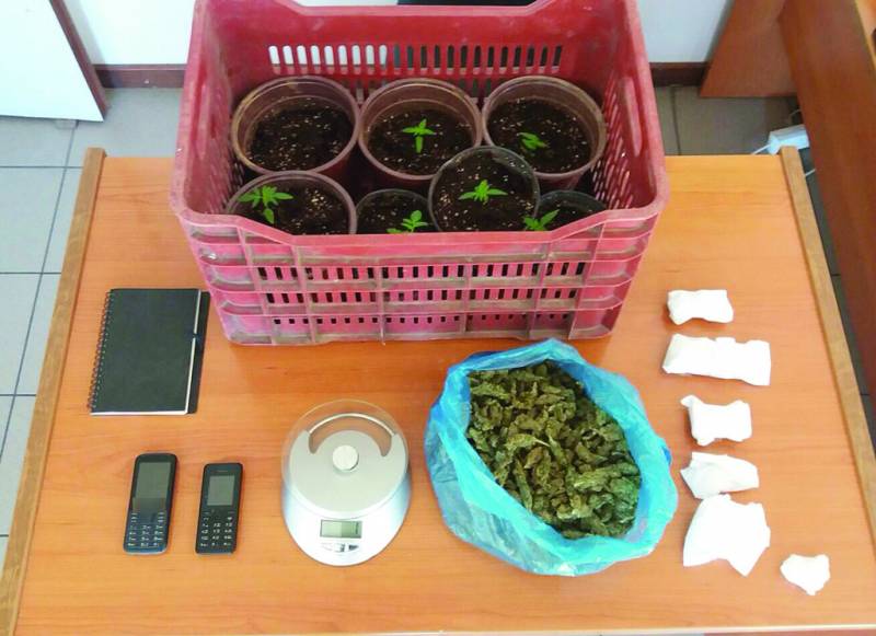 Στον κήπο, ο κατηγορούμενος καλλιεργούσε σε γλάστρες 7 δενδρύλλια χασίς, ύψους από 1 έως 10 εκατοστά. Τις γλάστρες τις είχε κρυμμένες πίσω από κάτι ξύλα και σύνεργα για το λιομάζωμα. Οι αστυνομικοί κατάσχεσαν επίσης μια ζυγαριά ακριβείας, δύο κινητά τηλέφωνα, καθώς και ένα μαύρο μπλοκ με ιδιόχειρες σημειώσεις, όπου υπήρχαν ονόματα, τηλέφωνα και χρηματικά ποσά.