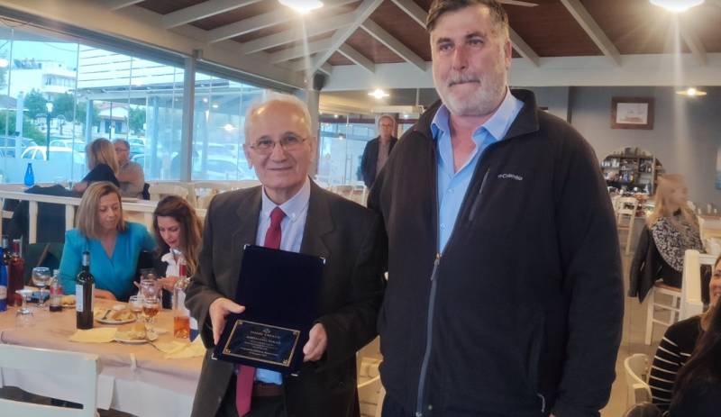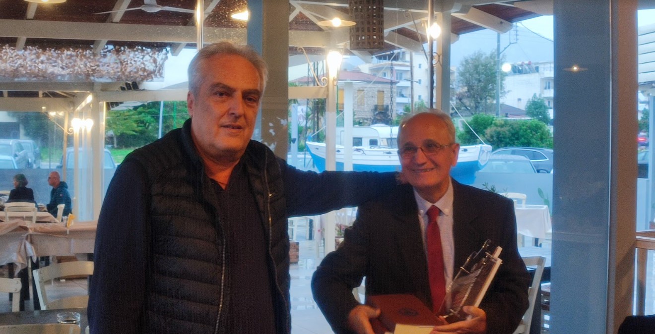 Τιμητική πλακέτα του απένειμε ο πρόεδρος του Δ.Σ. Κυπαρισσίας Θανάσης Πετρόπουλος που τόνισε: «Αγαπητέ συνάδελφε, αγαπημένε φίλε, που κόσμησες τον Δικηγορικό Σύλλογο, και ως μέλος του Δικηγορικού Συλλόγου αλλά και ως πρόεδρος επί πέντε θητείες, σαν ελάχιστο δείγμα ευγνωμοσύνης και αγάπης προς το πρόσωπό σου, σου απονέμει ο Δικηγορικός Σύλλογος, ο οποίος βρίσκεται εν ολομελεία σήμερα εδώ, μια τιμητική πλακέτα για να θυμάσαι τη σημερινή στιγμή αυτή. Σου ευχόμαστε, αυτή η συννεφιά, η πολύ συγκινητική και πολύ ρομαντική, που σήμερα συνόδευσε το γεύμα μας, από αύριο να είναι για εσένα μια ατελείωτη λιακάδα».