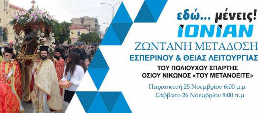 Ο περιφερειακός τηλεοπτικός σταθμός Ionian Channel, σε συνεργασία με την  Ιερά Μητρόπολη Μονεμβασίας και Σπάρτης,  θα πραγματοποιήσει απευθείας μεταδόσεις από τον εορτάζοντα Ιερό Ναό του Οσίου Νίκωνα, πολιούχου της Σπάρτης: