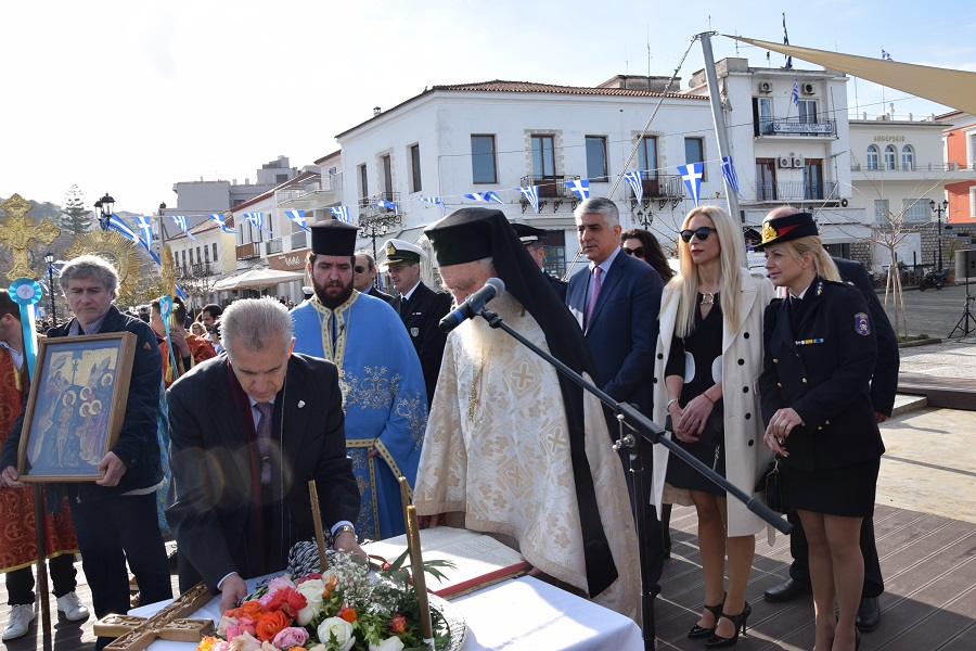Εκεί, ο iερέας, παρουσία του Δημάρχου, των μελών του Δημοτικού Συμβουλίου, του Τοπικού Συμβουλίου Πύλου και των εκπροσώπων των Στρατιωτικών Αρχών, πραγματοποίησε τη ρίψη του Τιμίου Σταυρού στη θάλασσα. Παρά την γενικότερη κακοκαιρία που έπληξε τον τόπο μας τις τελευταίες ημέρες, σήμερα ο ηλιόλουστος και ήρεμος από ανέμους καιρός ήταν ο καλύτερος σύμμαχος για τους νεαρούς και τις νεαρές που βούτηξαν στη θάλασσα για να πιάσουν τον Τίμιο Σταυρό και να πάρουν τη χάρη και την ευλογία του.