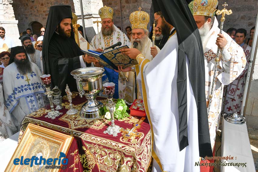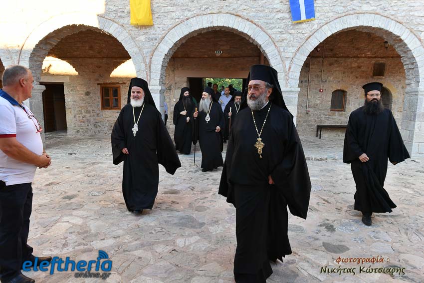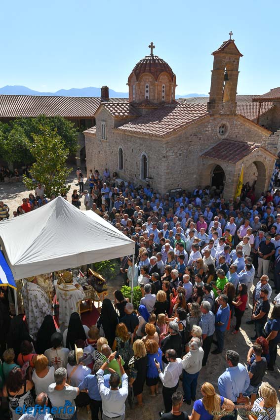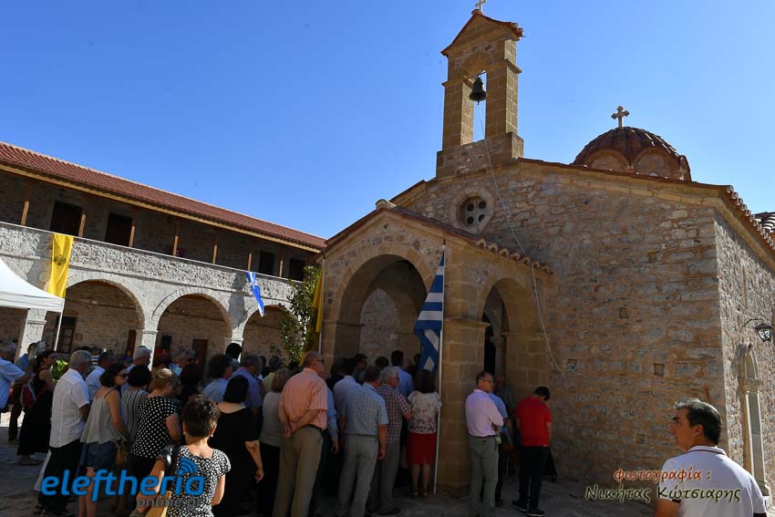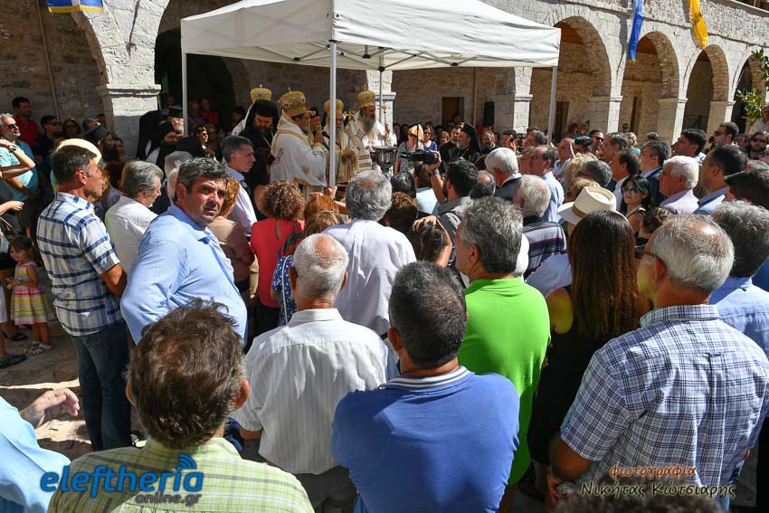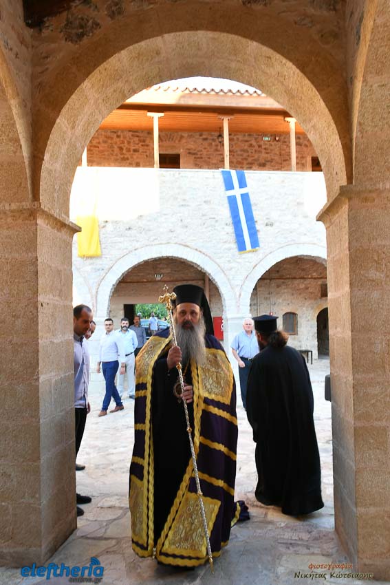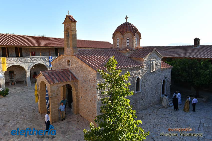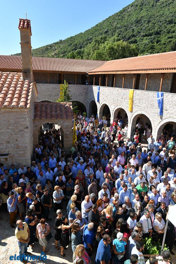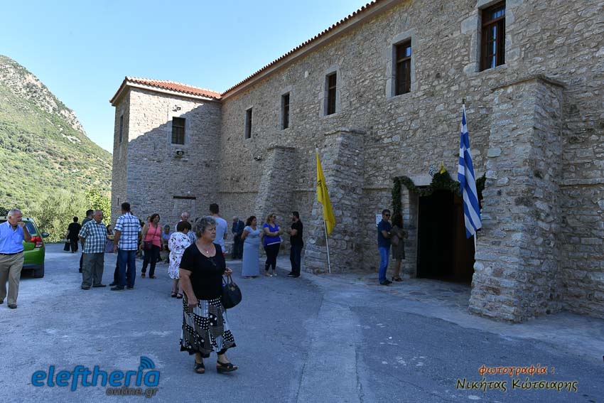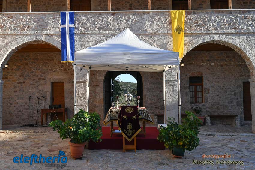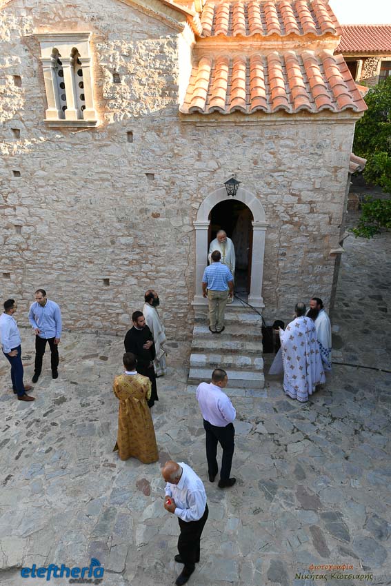 Στον όρθρο και την πολυαρχιερατική θεία λειτουργία στο Καθολικό της μονής συλλειτούργησαν τέσσερις μητροπολίτες, οι Μονεμβασίας και Σπάρτης Ευστάθιος, Καρθαγένης Μελέτιος, Σταγών και Μετεώρων Θεόκλητος και Μεσσηνίας Χρυσόστομος. Πιο συγκεκριμένα, στην ακολουθία του όρθρου χοροστάτησε ο μητροπολίτης Σταγών και Μετεώρων Θεόκλητος, ενώ την πανηγυρική θεία λειτουργία τέλεσε ο μητροπολίτης Μονεμβασίας και Σπάρτης Ευστάθιος, συλλειτουργούντων των μητροπολιτών Καρθαγένης Μελετίου, Σταγών και Μετεώρων Θεοκλήτου και Μεσσηνίας κ. Χρυσοστόμου. Στη συνέχεια τελέσθηκε ο αγιασμός, ακολούθησαν τα αποκαλυπτήρια της κτιτορικής επιγραφής της μονής και η είσοδος στο κτηριακό συγκρότημα.