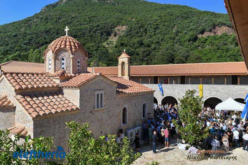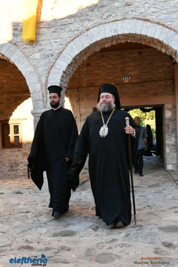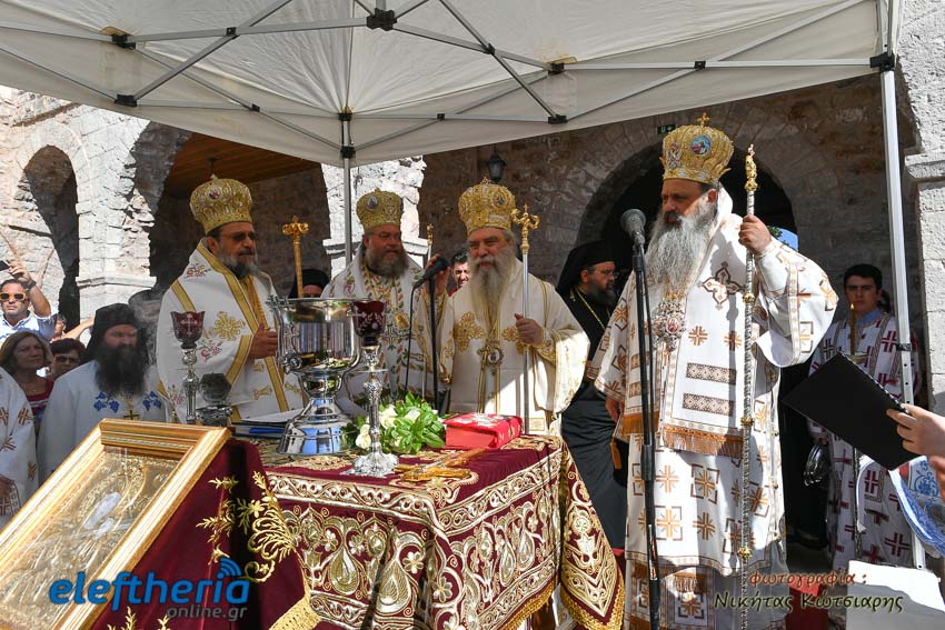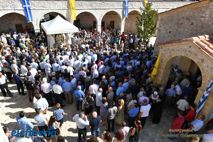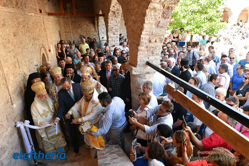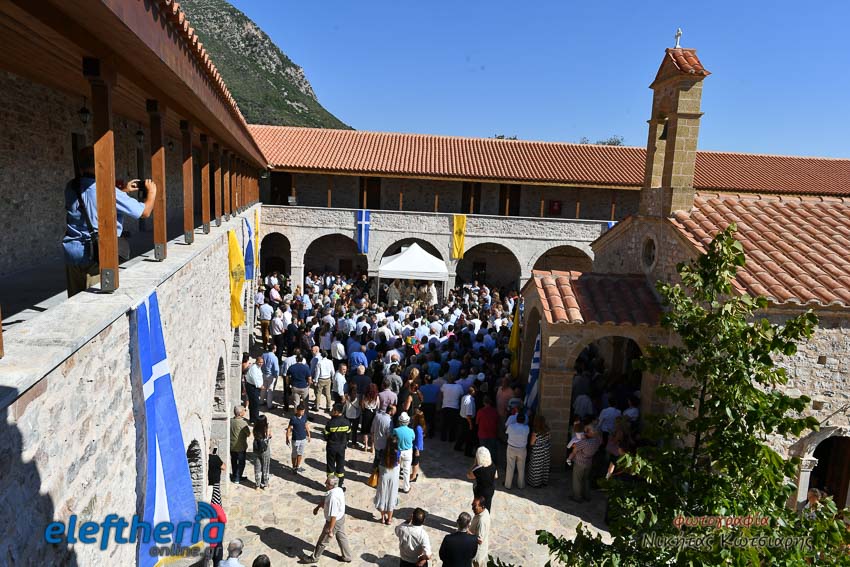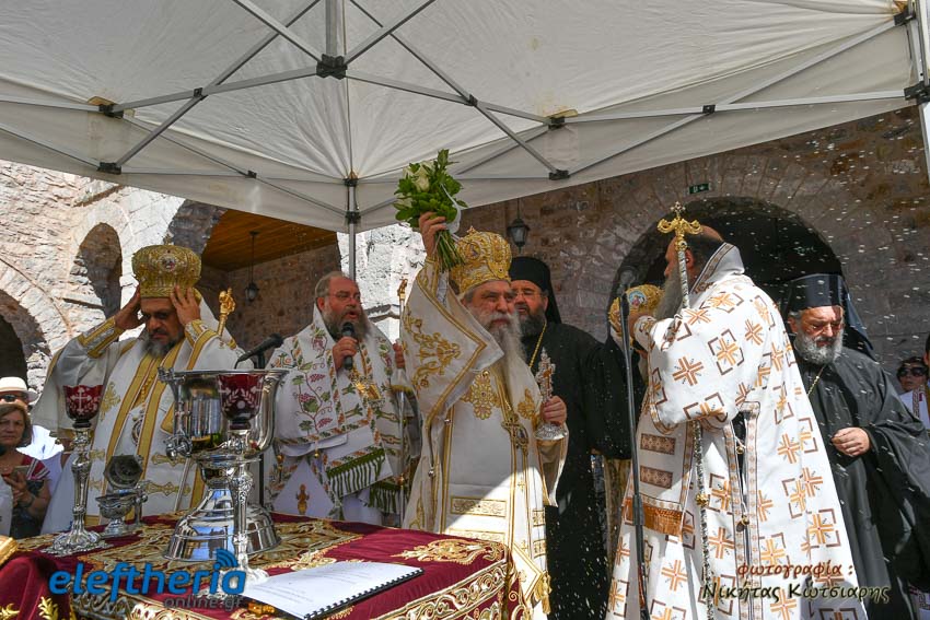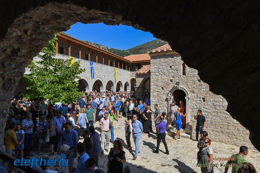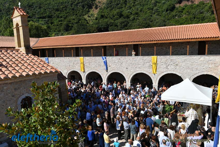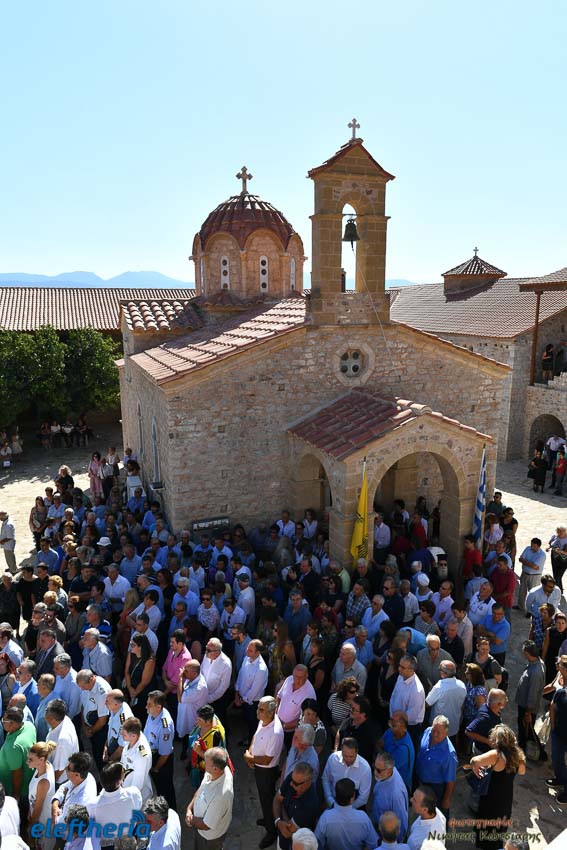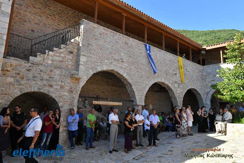 Στον όρθρο και την πολυαρχιερατική θεία λειτουργία στο Καθολικό της μονής συλλειτούργησαν τέσσερις μητροπολίτες, οι Μονεμβασίας και Σπάρτης Ευστάθιος, Καρθαγένης Μελέτιος, Σταγών και Μετεώρων Θεόκλητος και Μεσσηνίας Χρυσόστομος. Πιο συγκεκριμένα, στην ακολουθία του όρθρου χοροστάτησε ο μητροπολίτης Σταγών και Μετεώρων Θεόκλητος, ενώ την πανηγυρική θεία λειτουργία τέλεσε ο μητροπολίτης Μονεμβασίας και Σπάρτης Ευστάθιος, συλλειτουργούντων των μητροπολιτών Καρθαγένης Μελετίου, Σταγών και Μετεώρων Θεοκλήτου και Μεσσηνίας κ. Χρυσοστόμου. Στη συνέχεια τελέσθηκε ο αγιασμός, ακολούθησαν τα αποκαλυπτήρια της κτιτορικής επιγραφής της μονής και η είσοδος στο κτηριακό συγκρότημα.