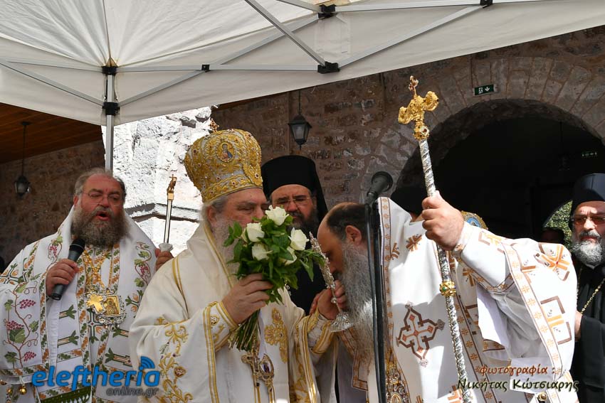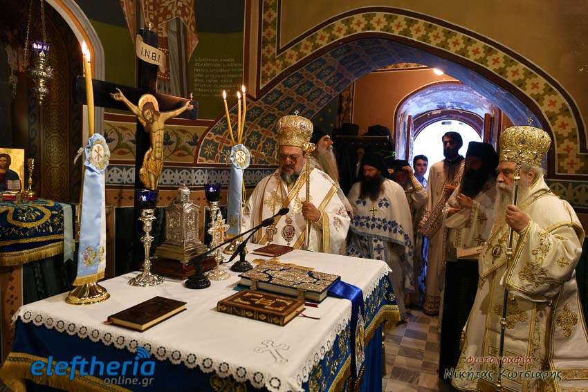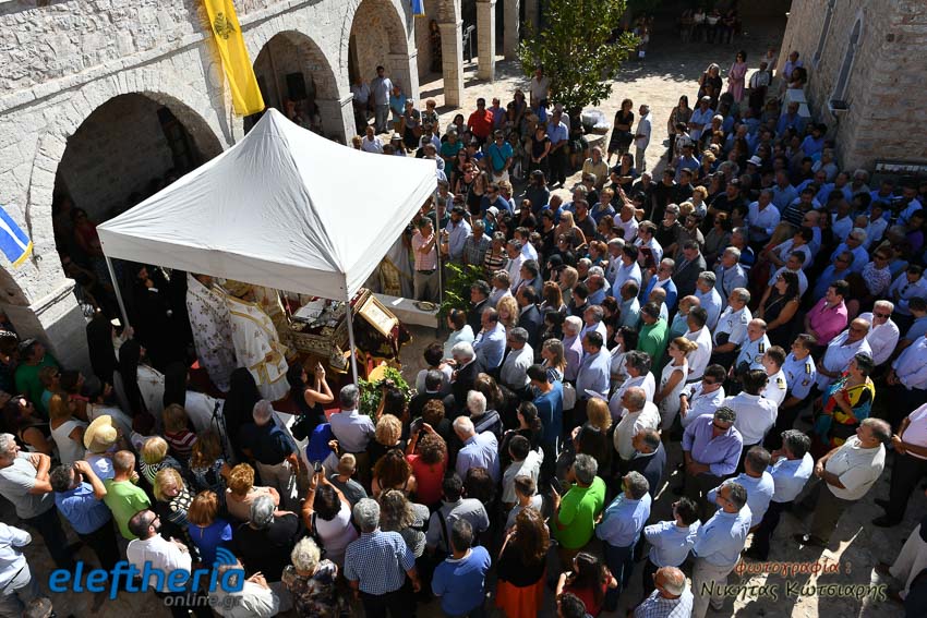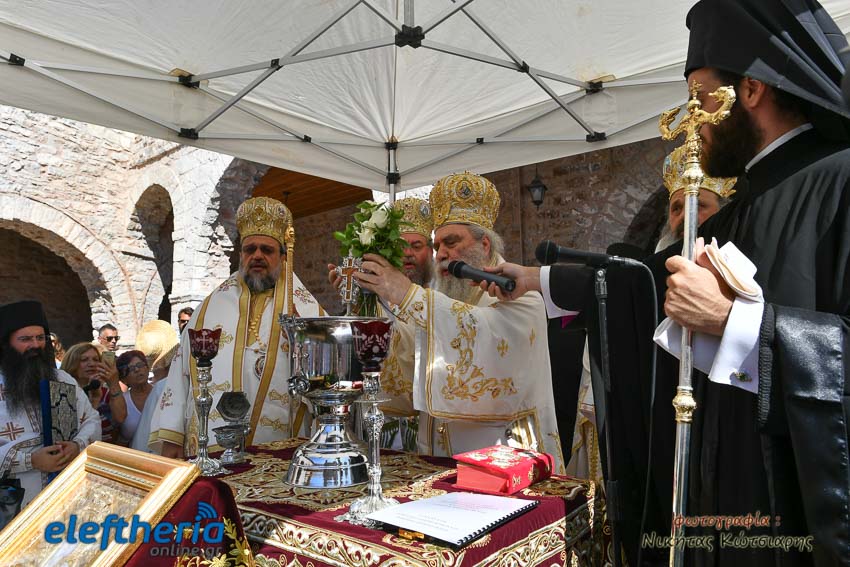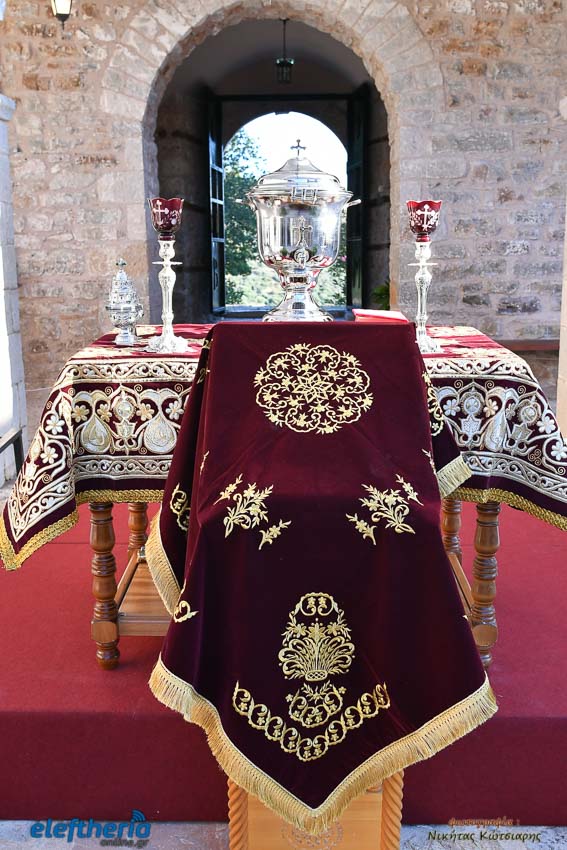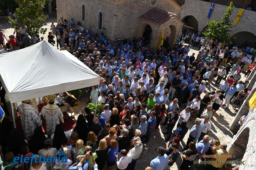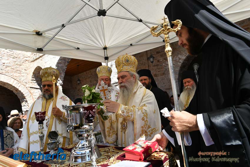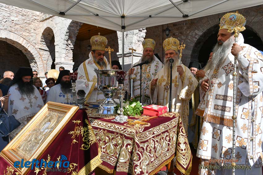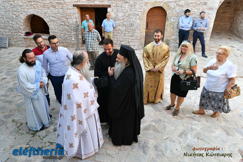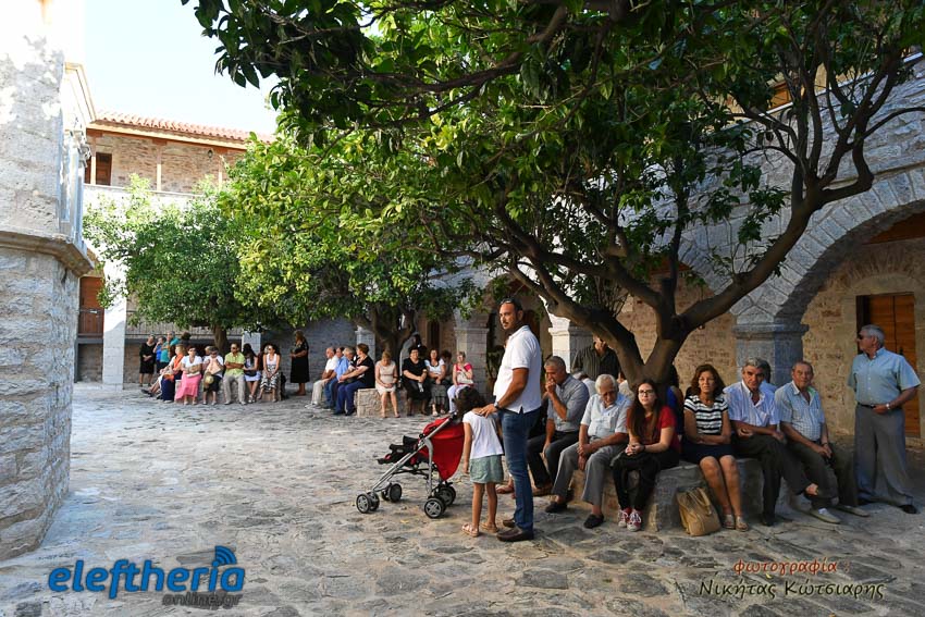 Στον όρθρο και την πολυαρχιερατική θεία λειτουργία στο Καθολικό της μονής συλλειτούργησαν τέσσερις μητροπολίτες, οι Μονεμβασίας και Σπάρτης Ευστάθιος, Καρθαγένης Μελέτιος, Σταγών και Μετεώρων Θεόκλητος και Μεσσηνίας Χρυσόστομος. Πιο συγκεκριμένα, στην ακολουθία του όρθρου χοροστάτησε ο μητροπολίτης Σταγών και Μετεώρων Θεόκλητος, ενώ την πανηγυρική θεία λειτουργία τέλεσε ο μητροπολίτης Μονεμβασίας και Σπάρτης Ευστάθιος, συλλειτουργούντων των μητροπολιτών Καρθαγένης Μελετίου, Σταγών και Μετεώρων Θεοκλήτου και Μεσσηνίας κ. Χρυσοστόμου. Στη συνέχεια τελέσθηκε ο αγιασμός, ακολούθησαν τα αποκαλυπτήρια της κτιτορικής επιγραφής της μονής και η είσοδος στο κτηριακό συγκρότημα.