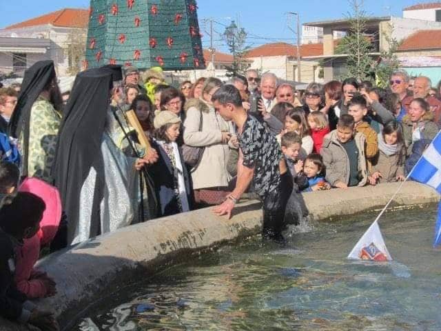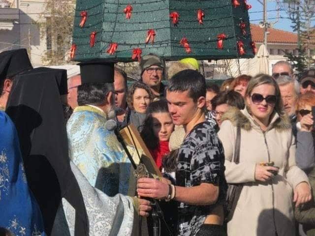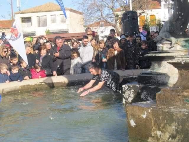 Ο αγιασμός των υδάτων και η κατάδυση του Σταυρού έγινε στο συντριβάνι στην κεντρική πλατεία της πόλης, ενώ τον Σταυρό έπιασε ο νεαρός Γιώργος Τζέγκας.