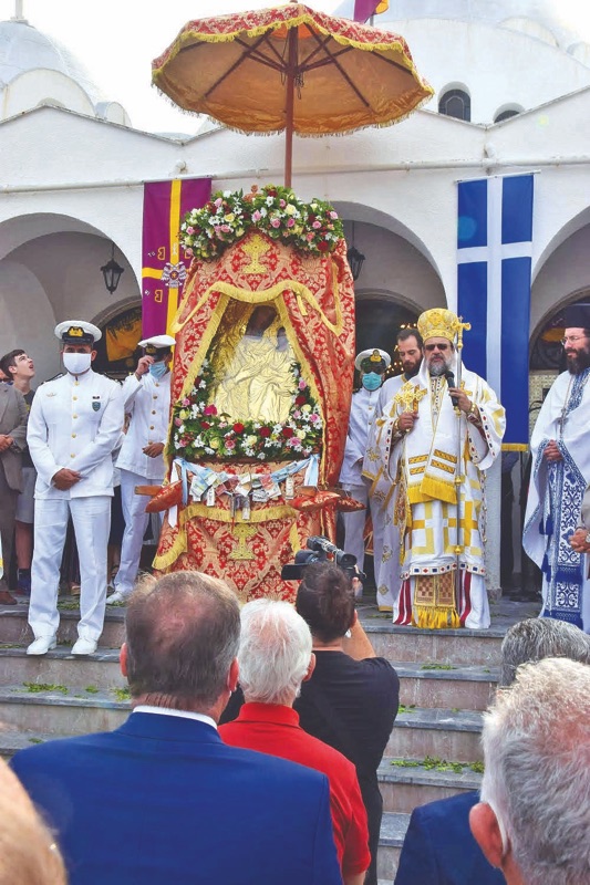 Την πανηγυρική θεία λειτουργία, στο ναό Κοιμήσεως της Θεοτόκου, όπου φυλάσσεται η θαυματουργή εικόνα της Παναγίας, τέλεσε ο μητροπολίτης Μεσσηνίας Χρυσόστομος, με τη συμμετοχή ιερέων. Με το πέρας της θείας λειτουργίας, η εικόνα εξήλθε του ναού έως τα προπύλαια, όπου και τελέστηκε δέηση υπέρ υγείας και ενίσχυσης των κατοίκων και των προσκυνητών.