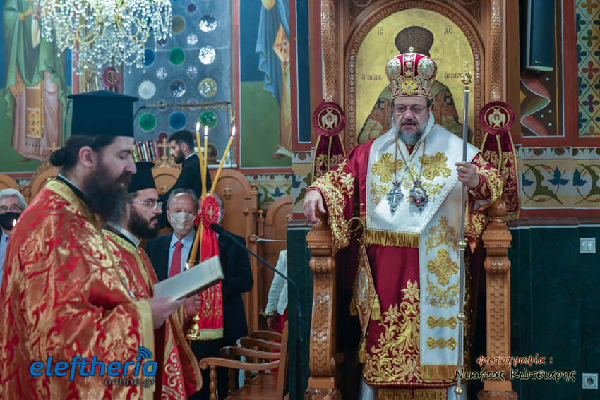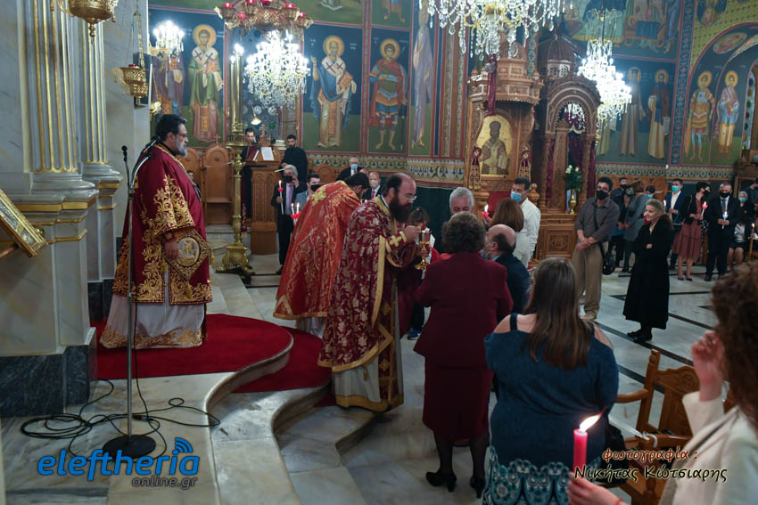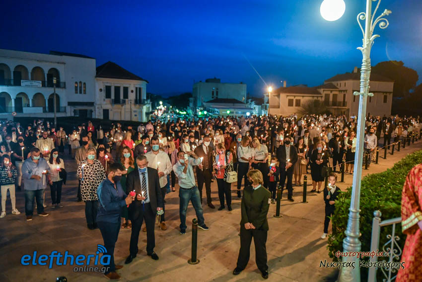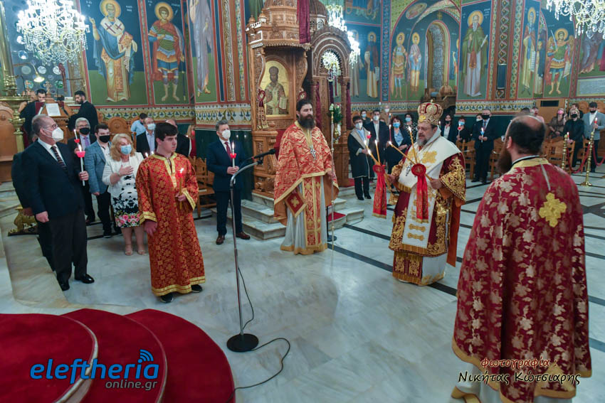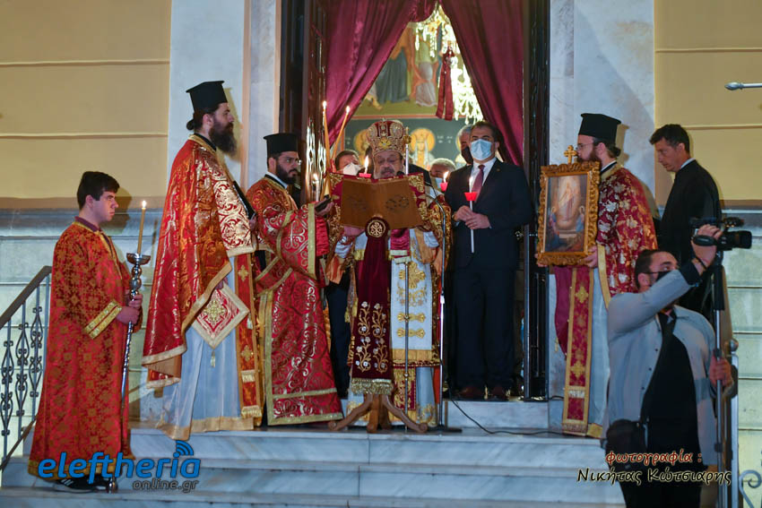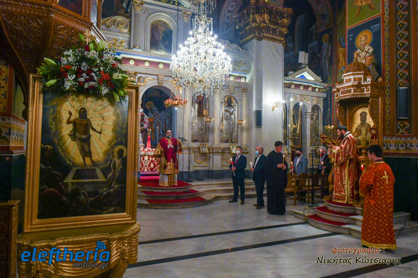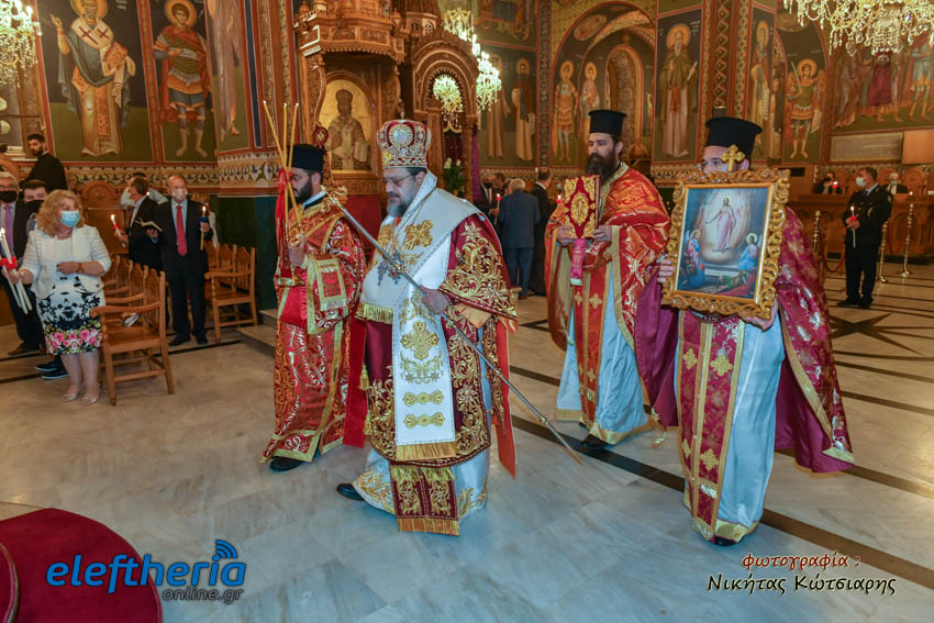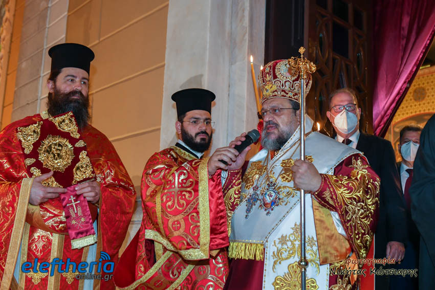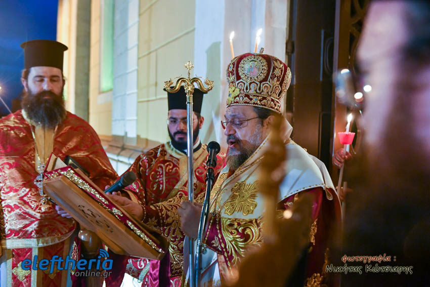 Αφού μετέδωσε το Άγιο Φως, προέστη της τελετής της Αναστάσεως στα προπύλαια του Μητροπολιτικού Ναού, παρουσία Εκπροσώπων Τοπικών Αρχών και Φορέων αλλά και των πιστών, οι οποίοι κρατούσαν αναμμένες λαμπάδες με το Αναστάσιμο Φως.