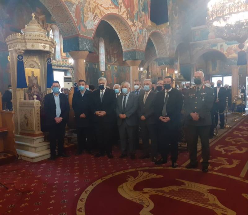 Στη θεία λειτουργία παρευρέθηκαν ως εκπρόσωπος της ελληνικής κυβέρνησης ο γενικός γραμματέας Εθνικής Άμυνας Αντώνης Οικονόμου, ο βουλευτής Αρκαδίας Κώστας Βλάσης, ο περιφερειάρχης Παναγιώτης Νίκας, ο αντιπεριφερειάρχης Αρκαδίας Χρήστος Λαμπρόπουλος, ο υποστράτηγος Λεωνίδας Γιοβάνης, ο τέως περιφερειάρχης Πέτρος Τατούλης, ο πρόεδρος του Δημοτικού Συμβουλίου Θεμιστοκλής Σακελλαριάδης, οι αντιδήμαρχοι Δημήτρης Σιέμπος και Θεοφάνης Καλογερόπουλος, ο περιφερειακός σύμβουλος Βαγγέλης Γιαννακούρας (τέως αντιπεριφεριάρχης), ο πρόεδρος της «Αρκαδία Α.Ε.» Παναγιώτης Μπούρας, οι δημοτικοί σύμβουλοι Αντώνης Κυριακόπουλος, Κώστας Μιχόπουλος, Δημήτρης Γιώτης, Σταύρος Αθανασόπουλος, Γιώργος Μαρκολιάς, ο αστυνόμος Α’ Παναγιώτης Κουρτέσης, ο αντιπύραρχος Χρήστος Μπουντούρης και πλήθος πολιτών.