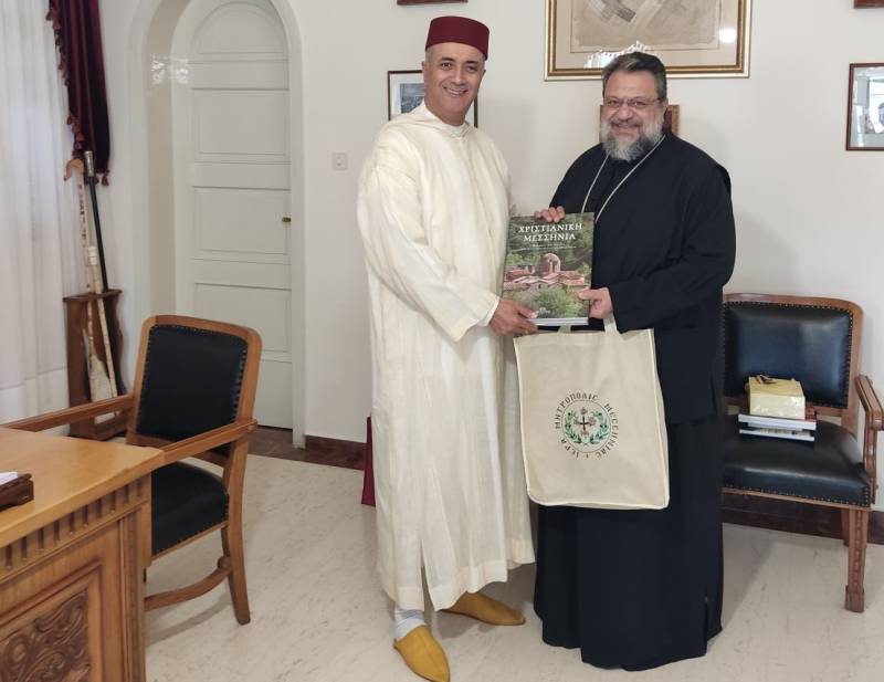 Τον κ. πρέσβη και την συνοδεία του υποδέχθηκε ο Μητροπολίτης Μεσσηνίας Χρυσόστομος και στο πλαίσιο αυτής της συνάντησης τους ενημέρωσε για τις κοινωνικές δραστηριότητες της τοπικής εκκλησίας, τα υφιστάμενα προβλήματα της τοπικής κοινωνίας καθώς και για το θέμα των διαθρησκειακών διαλόγων, την πορεία και τα προσδοκόμενα αποτελέσματά τους, για τα οποία έδειξαν ιδιαίτερο ενδιαφέρον.