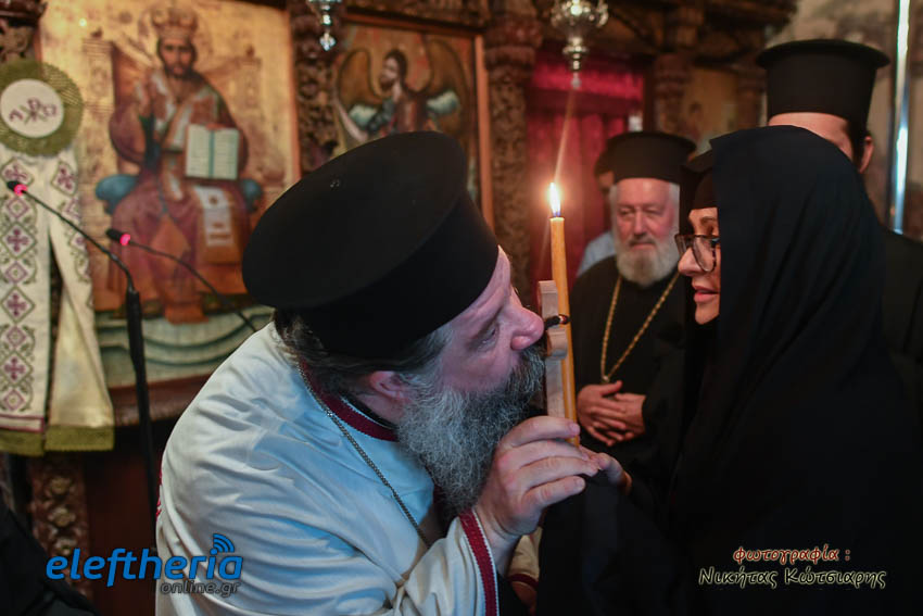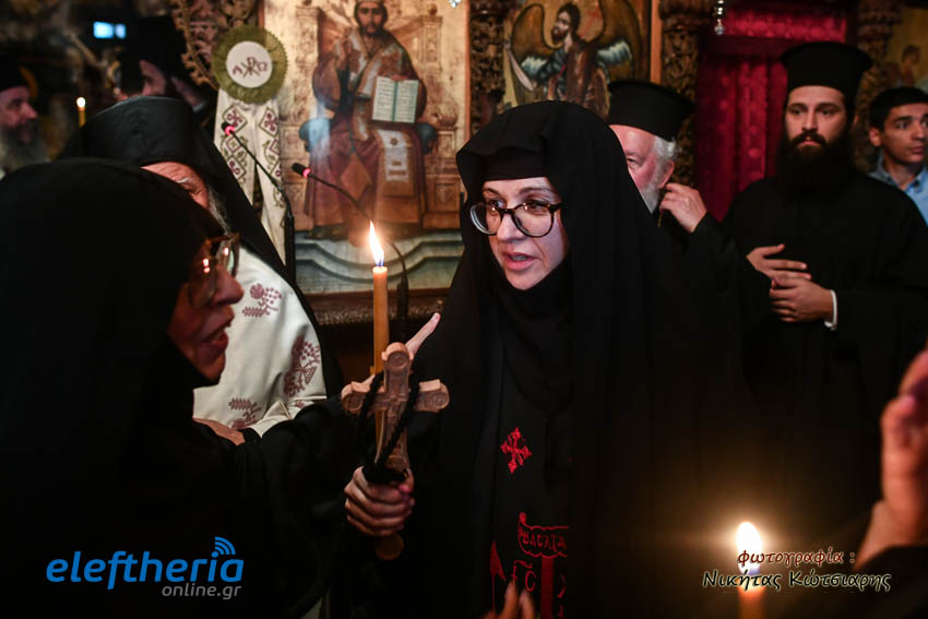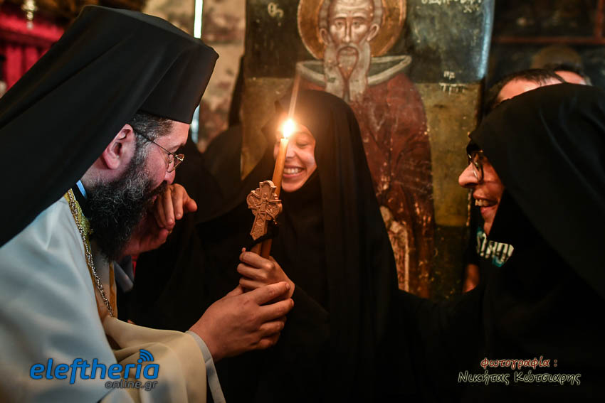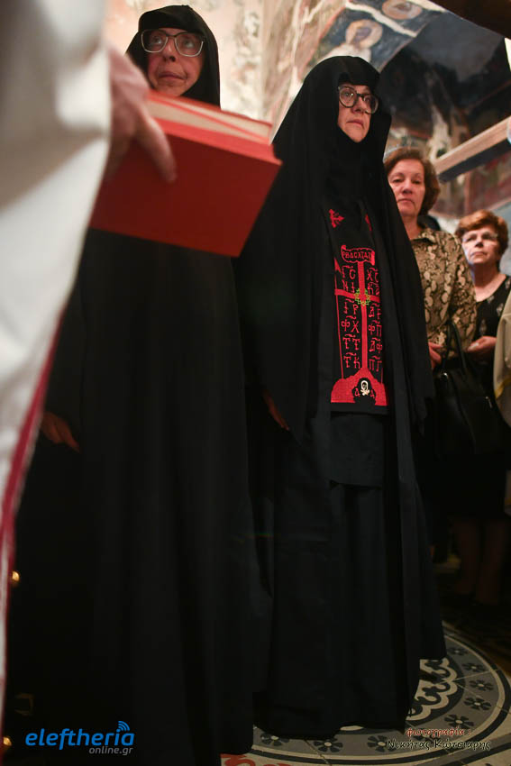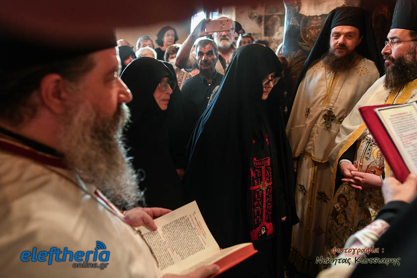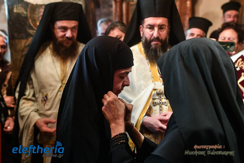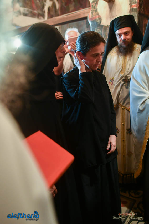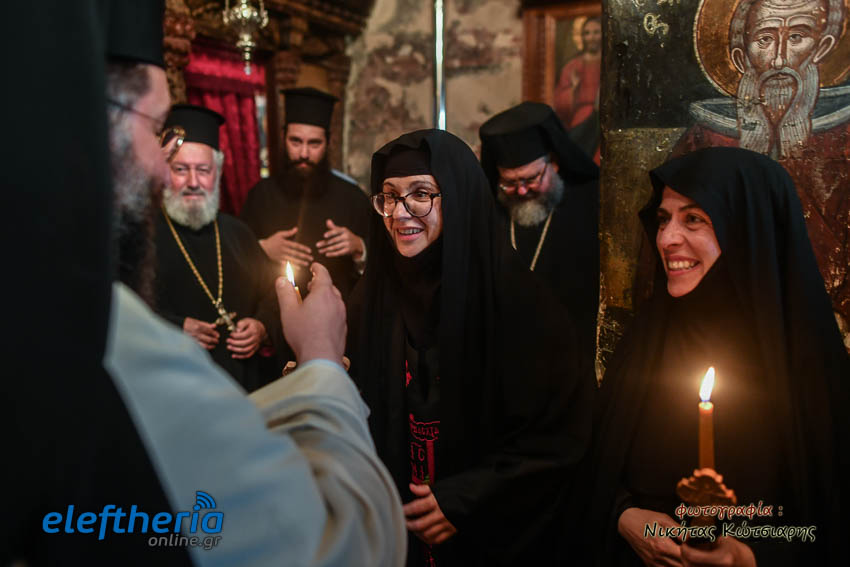 Πριν τον εσπερινό, ο κ. Χρυσόστομος τέλεσε την ακολουθία του Μικρού Σχήματος στην αδελφή Μακαρία και την ρασοφορία στην μέχρι σήμερα δόκιμη μοναχή Αδαμαντία, μετονομάζοντάς την Αλεξία μοναχή. Μετά το πέρας των ακολουθιών ευχήθηκε στις νέες μοναχές “να είναι ισάξιες των ονομάτων τους, αφού το όνομα Μακαρία συμβολίζει την μακαριότητα και την ευτυχία, ενώ το όνομα Αλεξία συμβολίζει τον άνθρωπο του Θεού”, όπως χαρακτηριστικά ανέφερε.