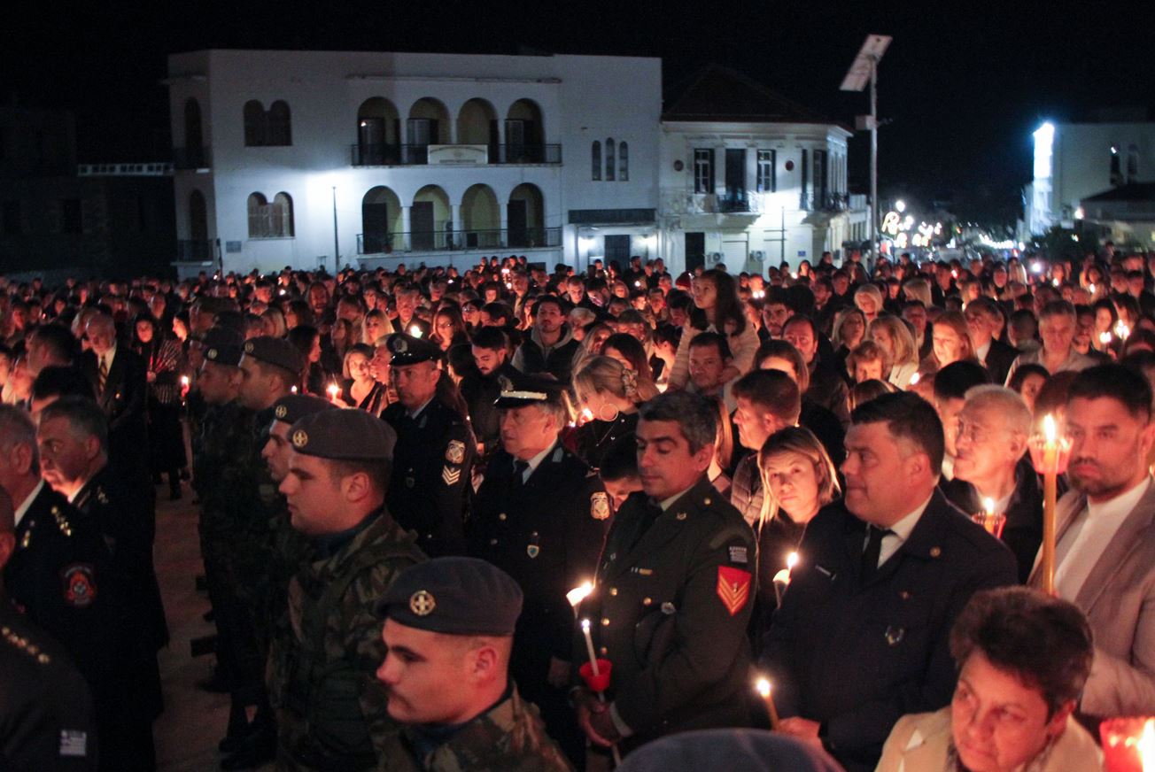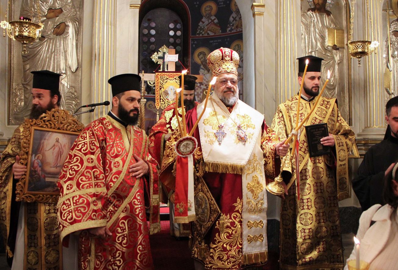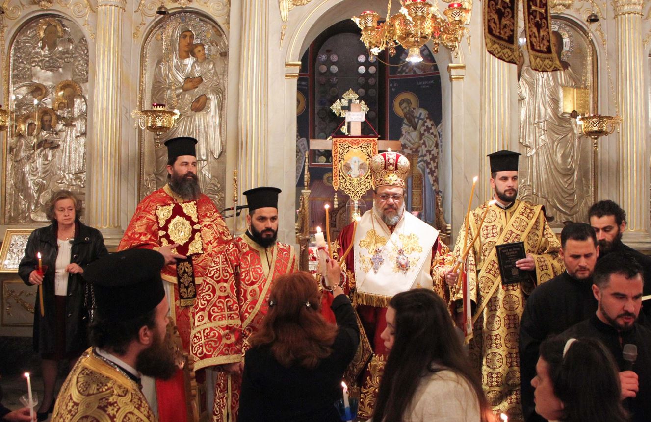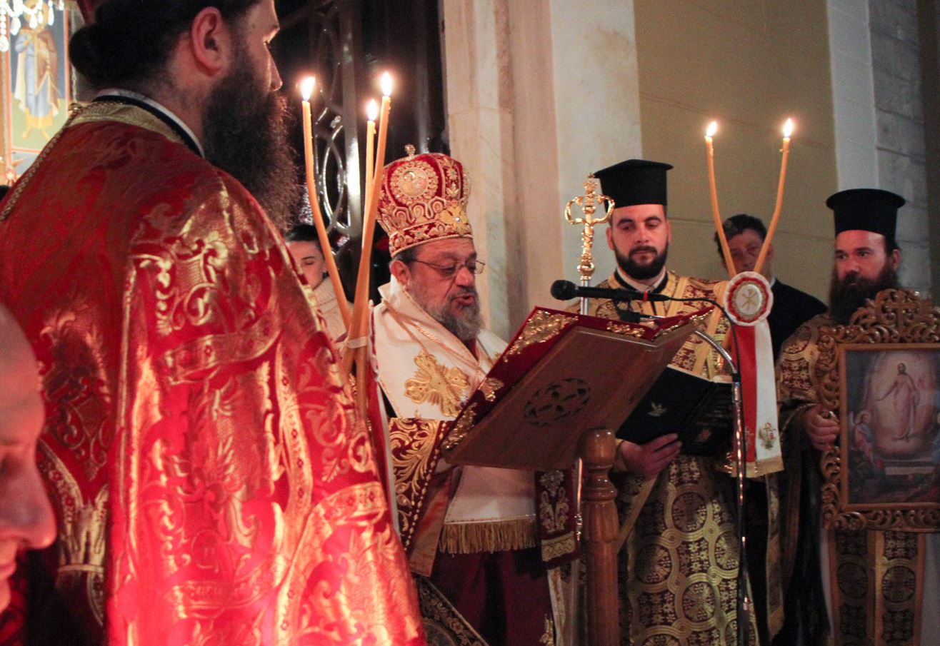 Ο Μητροπολίτης μετά την ανάγνωση του Ιερού Ευαγγελίου και υπό τους ήχους χαρμοσύνων κωδωνοκρουσιών, ανήγγειλε το «Χριστός Ανέστη». Απευθυνόμενος στους πιστούς ανέφερε ότι η Ανάσταση του Χριστού αποτελεί την έσχατη προσδοκία του ανθρώπου και τον τελικό του προορισμό, καθώς και την πρόγευση της αιώνιας βασιλείας του. Συνάμα ευχήθηκε υγεία και χρόνια πολλά προς όλους.