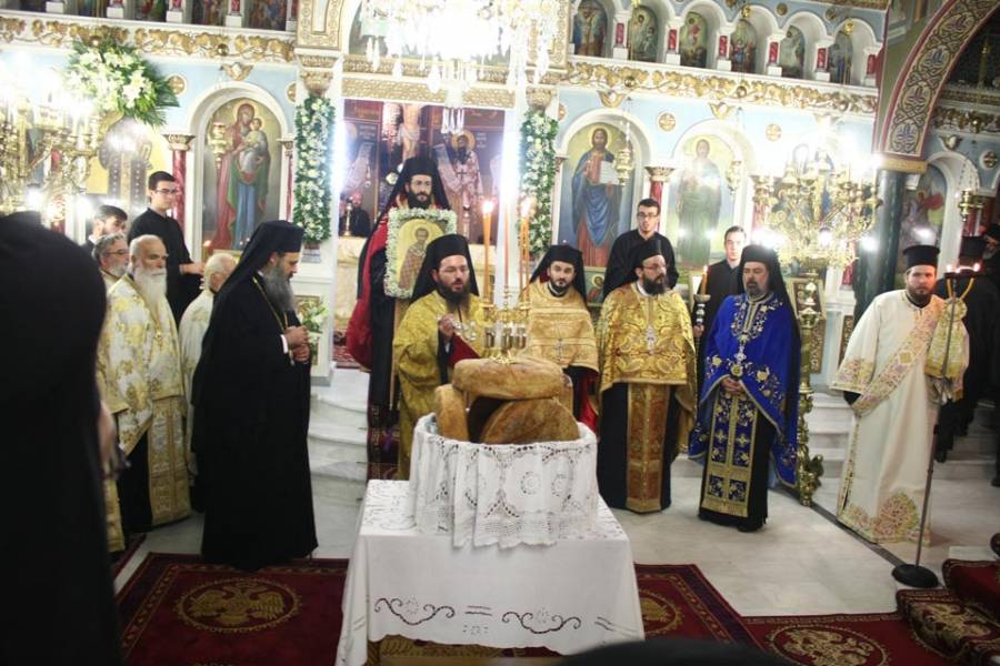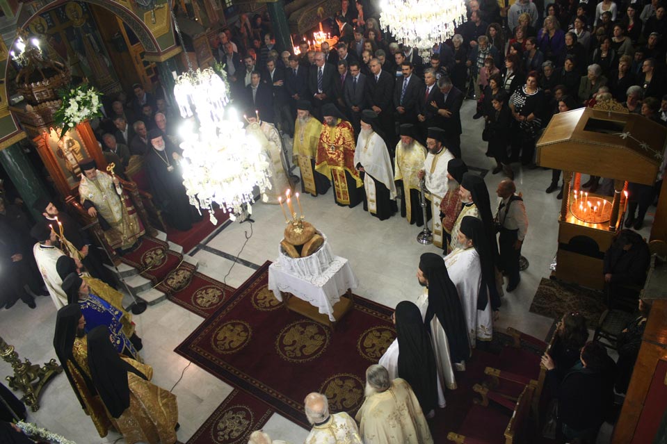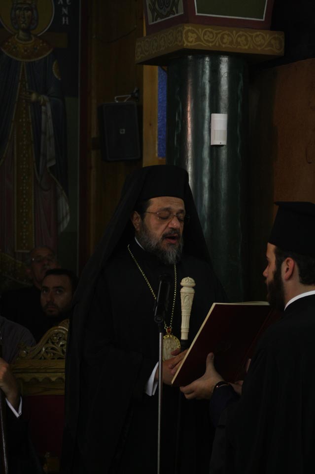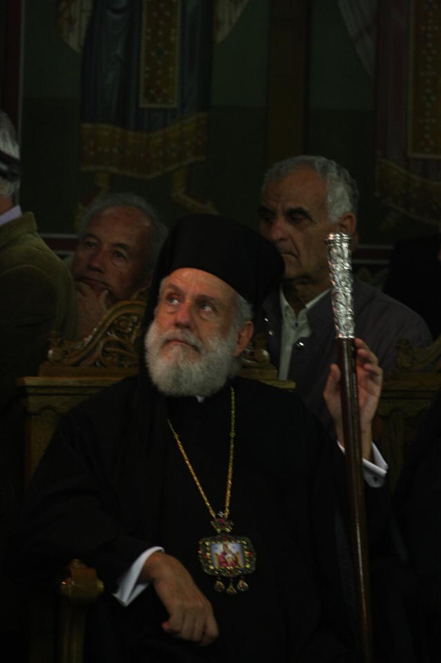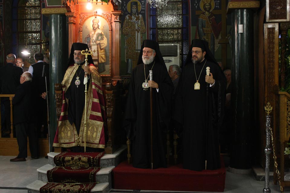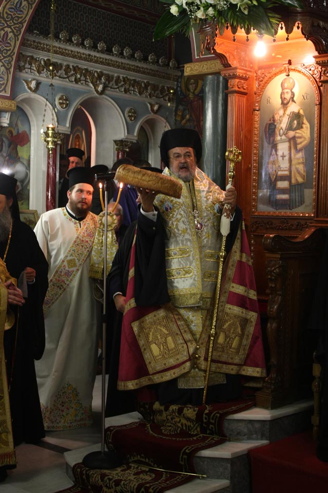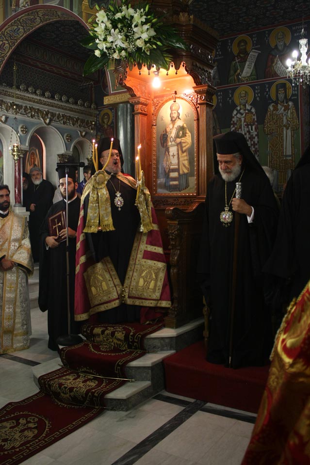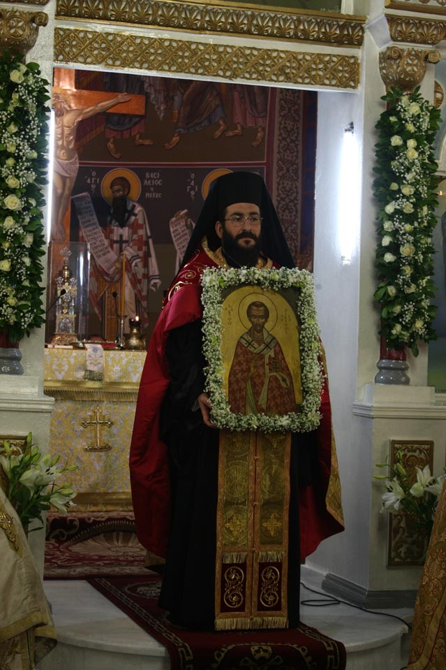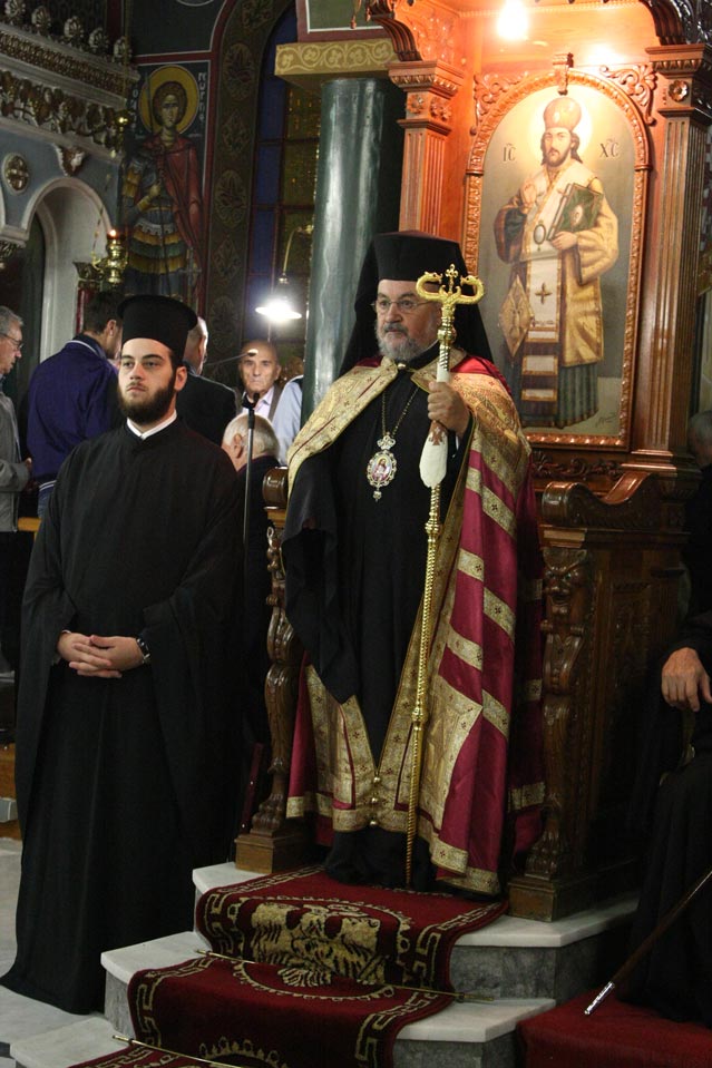 Του πανηγυρικού Εσπερινού χοροστάτησε ο Μητροπολίτης Μαραθώνος Μελίτων, συγχοροστατούντων των Μητροπολιτών Σύρου Δωροθέου και του οικείου Ποιμενάρχου Χρυσοστόμου. Τον Θείο Λόγο κήρυξε ο Μητροπολίτης Μαραθώνος, ο οποίος αναφέρθηκε στην προσωπικότητα του Άγίου και στον εορτάζοντα Μητροπολίτη.