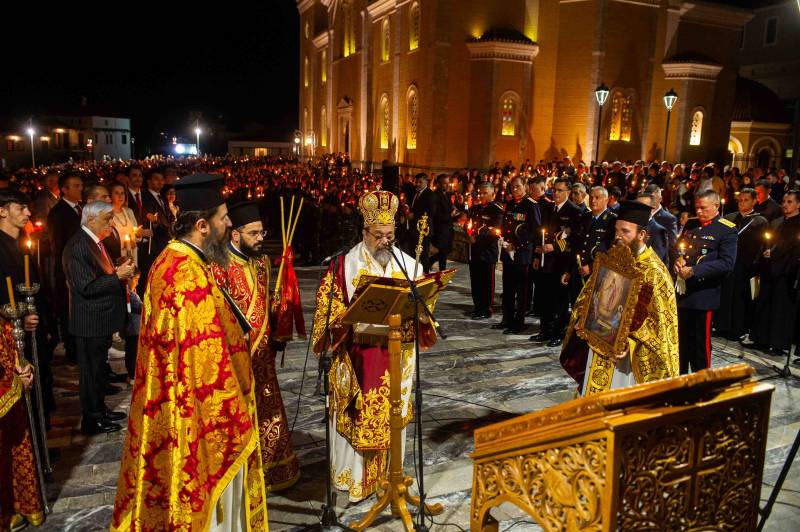 Αφού μετέδωσε το Άγιο Φως, προέστη της τελετής της Αναστάσεως στον αύλειο χώρο του Μητροπολιτικού Ναού, παρουσία εκπροσώπων Αρχών και Φορέων και πλήθους πιστών.