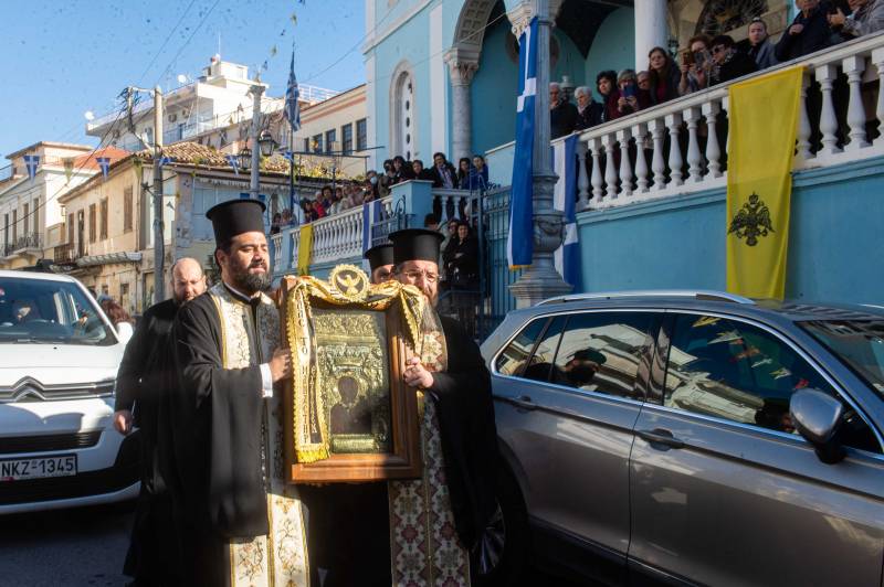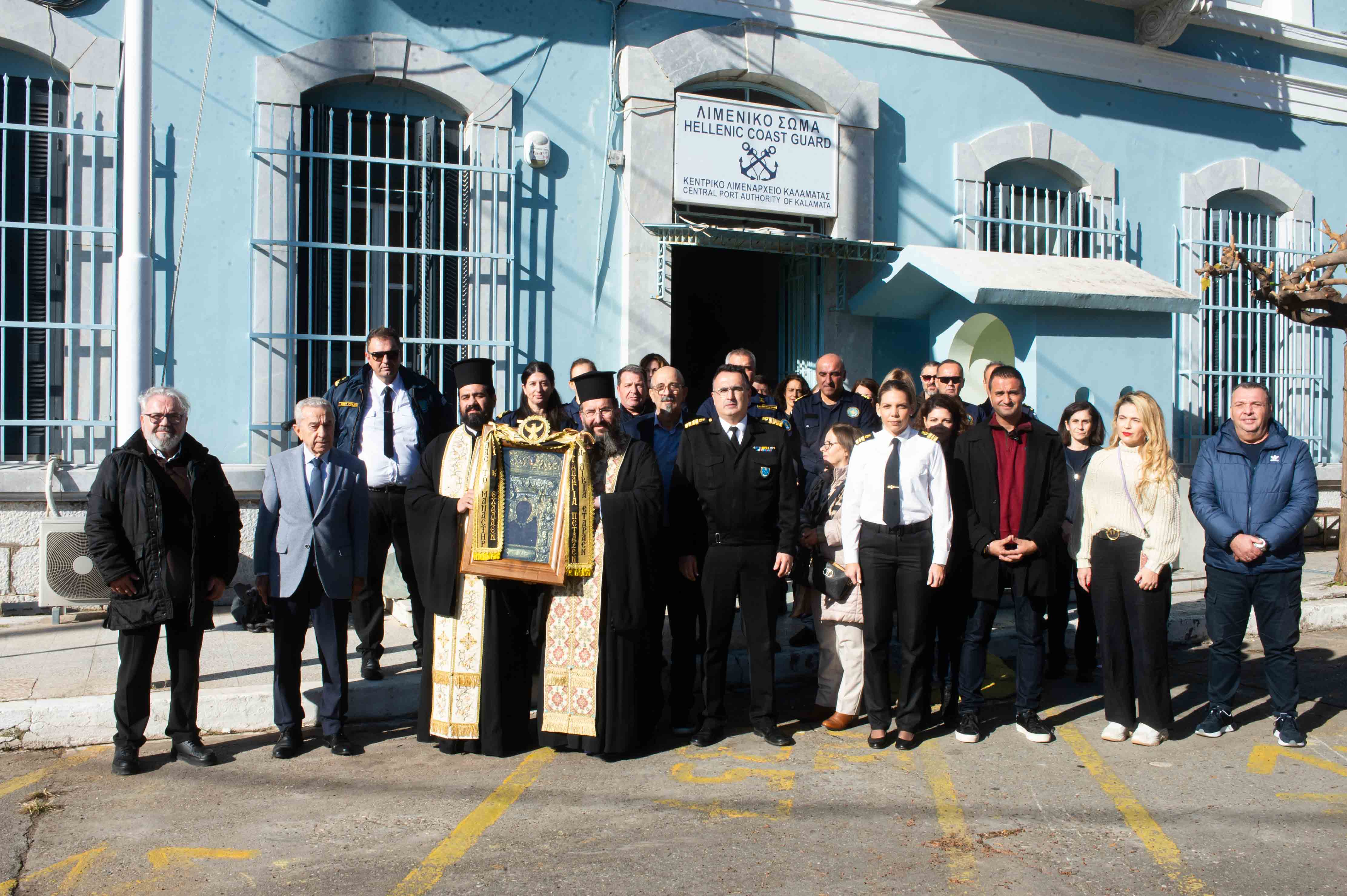 Στη συνέχεια η εικόνα αναχώρησε από τον ναό του Αγίου Νικολάου και ως ένδειξη τιμής στον αγώνα που καταβάλλεται από το Λιμενικό Σώμα για την προάσπιση των θαλάσσιων συνόρων μας, πραγματοποιήθηκε ολιγόλεπτη στάση στο Λιμεναρχείο Καλαμάτας, όπου έγινε δέηση.