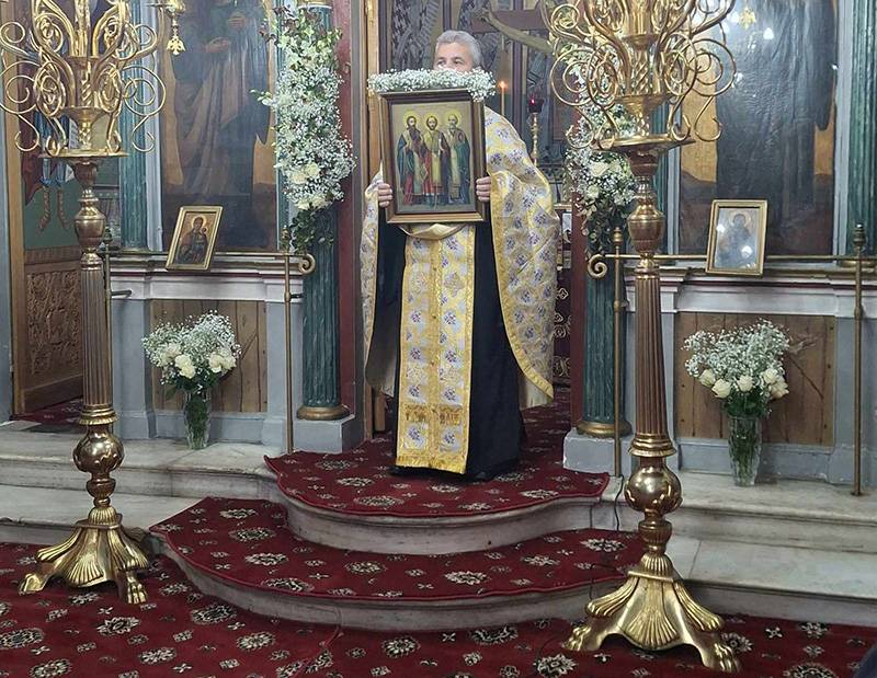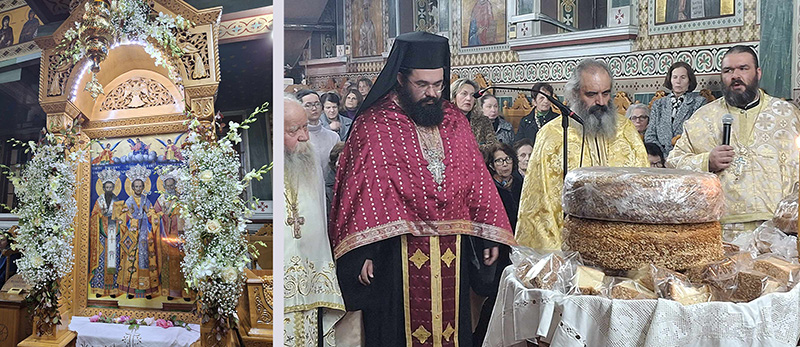 Χθες, παραμονή της εορτής, τελέστηκε εσπερινός με αρτοκλασία, ενώ ο ναός, ευπρεπισμένος και κατάλληλα προετοιμασμένος, υποδέχθηκε σήμερα τη μεγάλη γιορτή προς τιμήν των τριών διακεκριμένων Αγίων και θεολόγων: του Μεγάλου Βασιλείου, του Ιωάννη του Χρυσοστόμου και του Γρηγορίου του Ναζιανζηνού.