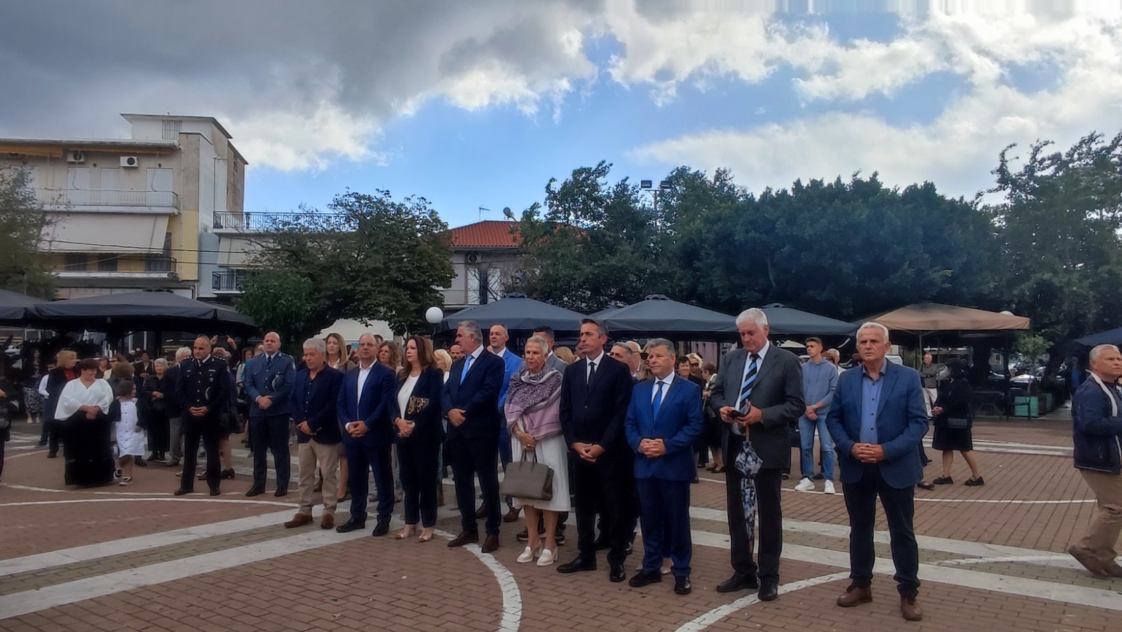 Στην κεντρική πλατεία εψάλη δέηση και ο κ. Χρυσόστομος αναφερόμενος στον Άγιο Διονύσιο σημείωσε μεταξύ άλλων ότι είναι ο πρώτος χριστιανός των Αθηνών, ο πρώτος εκείνος εκ των οποίων αφήνει τα έδρανα του Αρείου Πάγου και κατεβαίνει στα θρανία της μαθητείας του Αποστόλου Παύλου.