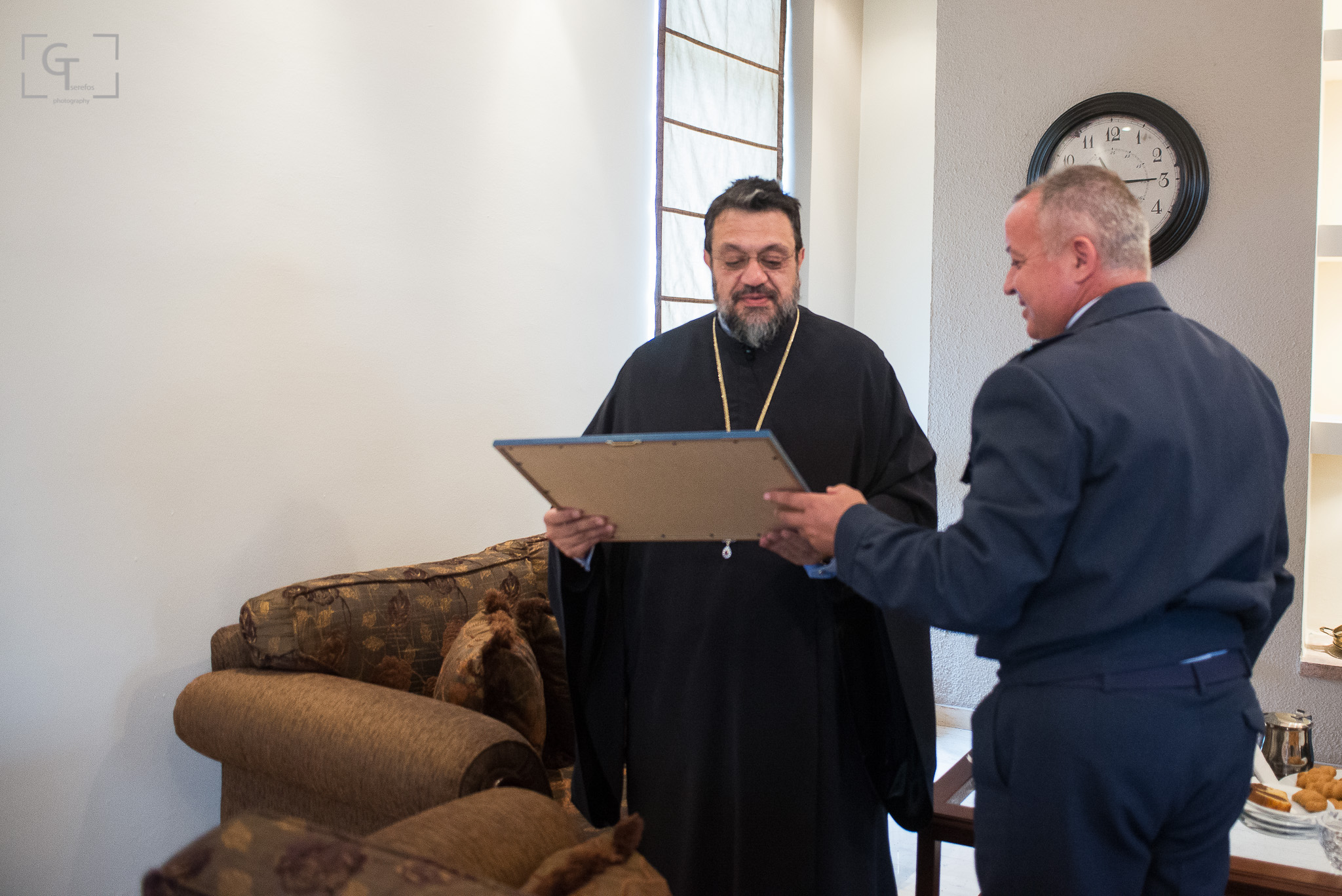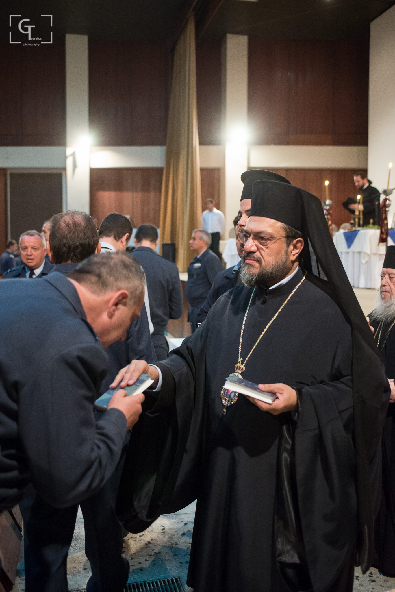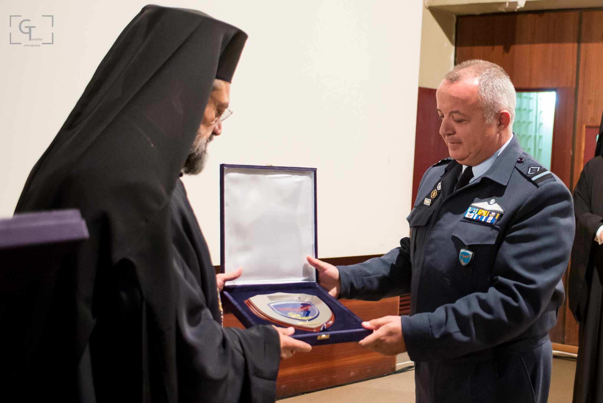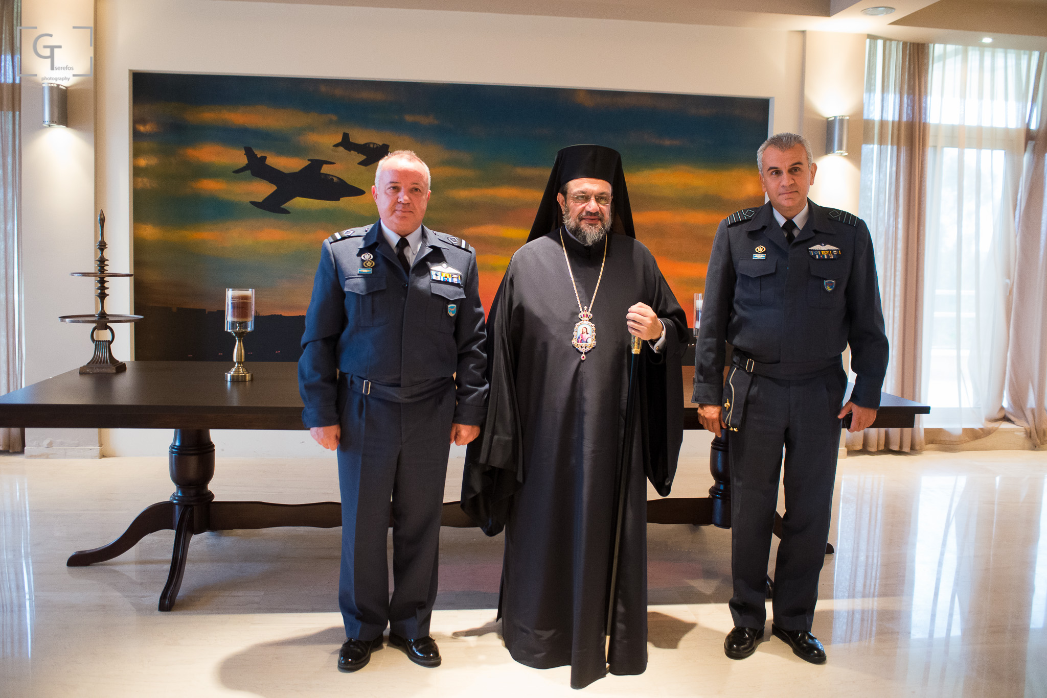 Ο Σεβασμιώτατος, στο σύντομο λόγο του, τόνισε ότι η πατρίδα μας περνάει δύσκολες στιγμές λόγω της έλλειψης ηθικών και κοινωνικών αξιών, γεγονός που οδήγησε στην αλλοτρίωση. Παράλληλα, ευχαρίστησε τον Ταξίαρχο και όλο το προσωπικό για την πρόσκληση και τη θερμή υποδοχή.