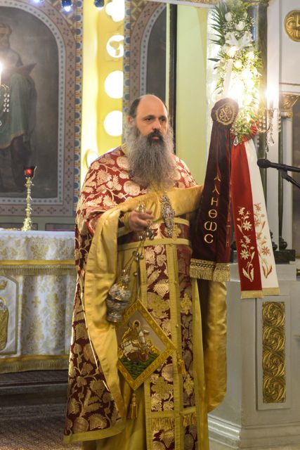 Ο κ. Χρυσόστομος στο κήρυγμα του αναφέρθηκε στα μηνύματα της Αναστάσεως του Χριστού, καθώς και στο βίο του εορτάζοντος Αγίου.