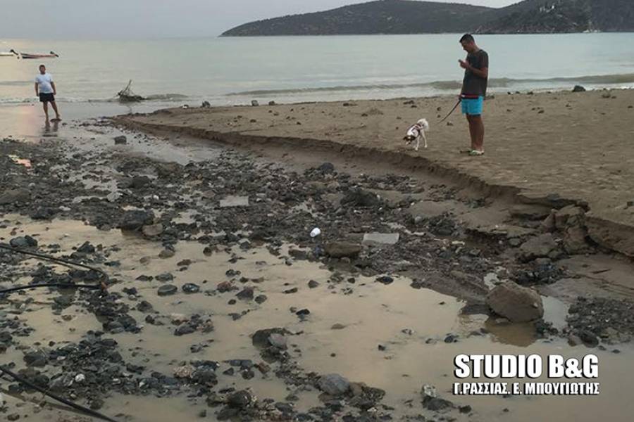 Όπως δήλωσε στο ΑΠΕ - ΜΠΕ, ο δήμαρχος Ναυπλιέων Δημήτρης Κωστούρος, η δυνατή βροχή παρέσυρε την άμμο στην παραλία, όπως επίσης και τα νερά που κατέβασε από το βουνό, ο γειτονικός χείμαρρος.