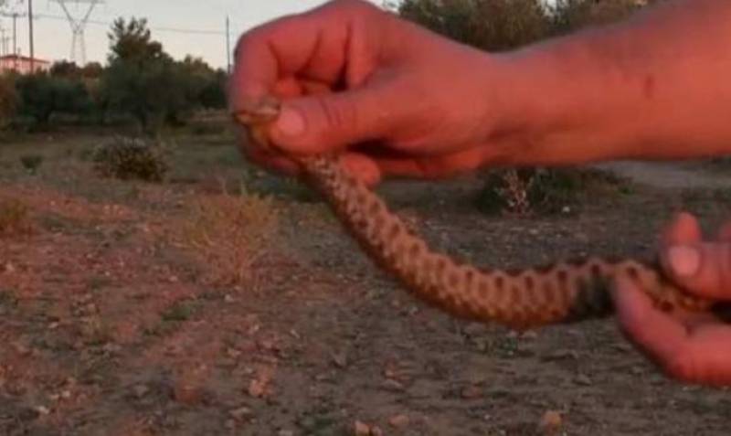 Ο θαρραλέος αγρότης εντόπισε τη μήκους 70 εκατ. οχιά σε έναν ψηλό τενεκέ, στο κτήμα του και δεν μπορούσε να βγει. Αργότερα, το άφησε ελεύθερο. Αλλά φρόντισε πρώτα, κρατώντας τη στα χέρια του, να δώσει συμβουλές για το τι πρέπει να κάνει όποιος συναντήσει το μοναδικό δηλητηριώδες φίδι στη χώρα μας.