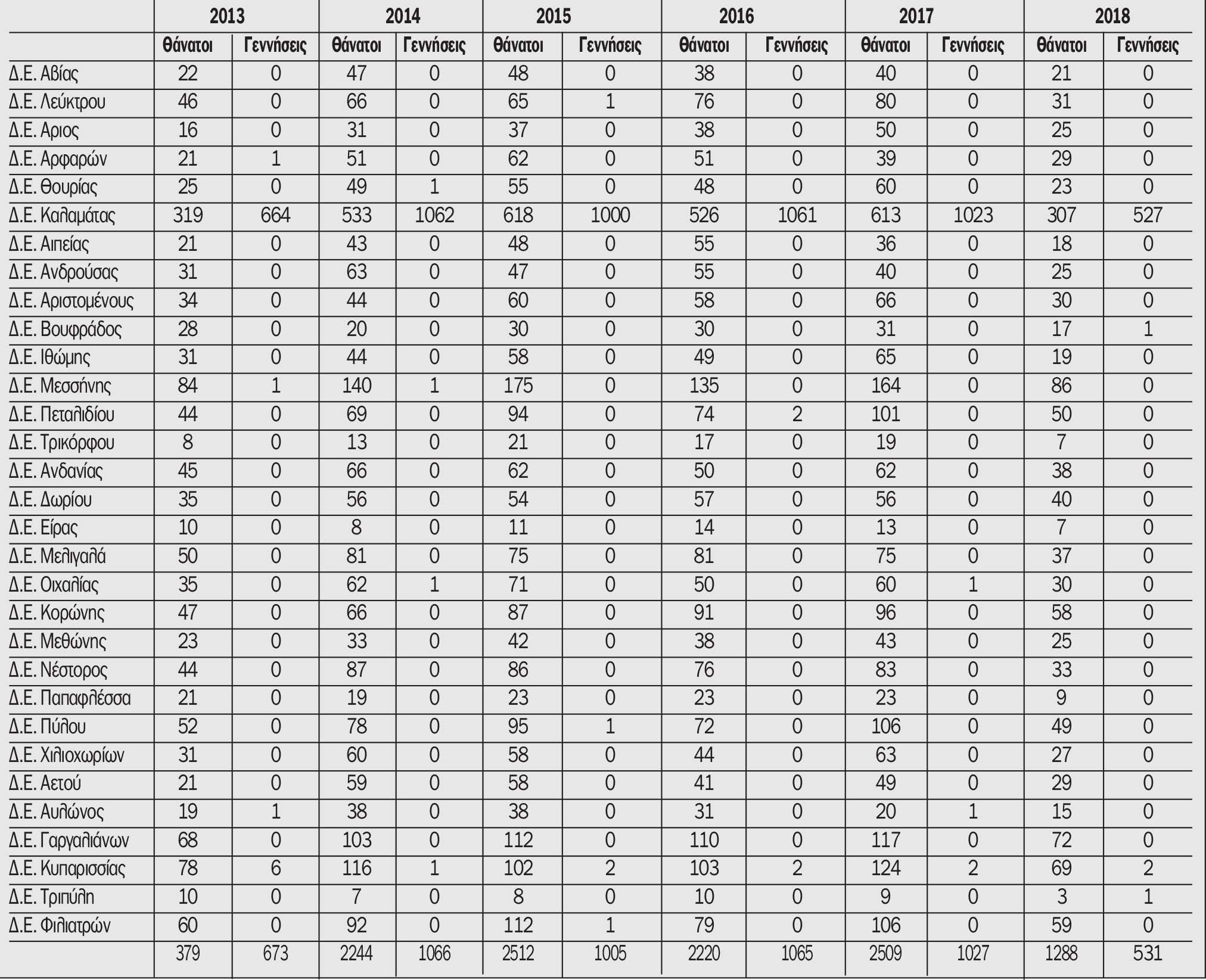 Συγκεκριμένα -και σύμφωνα με τα στοιχεία του υπουργείου Εσωτερικών- από το 2013 μέχρι τις 23 Ιουλίου 2018 είχαν καταγραφεί στα ληξιαρχεία της Μεσσηνίας 12.152 θάνατοι και μόλις 5.367 γεννήσεις.