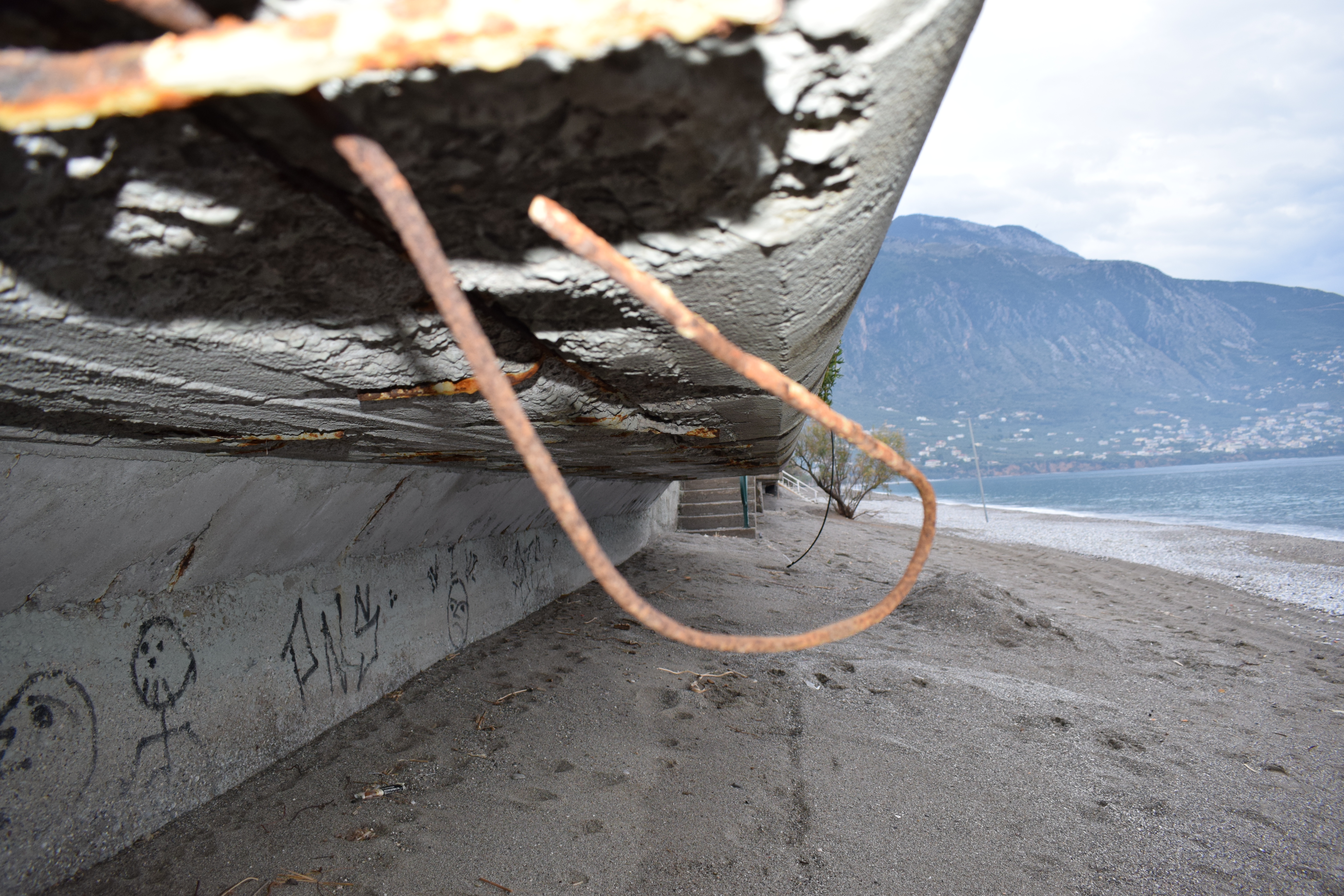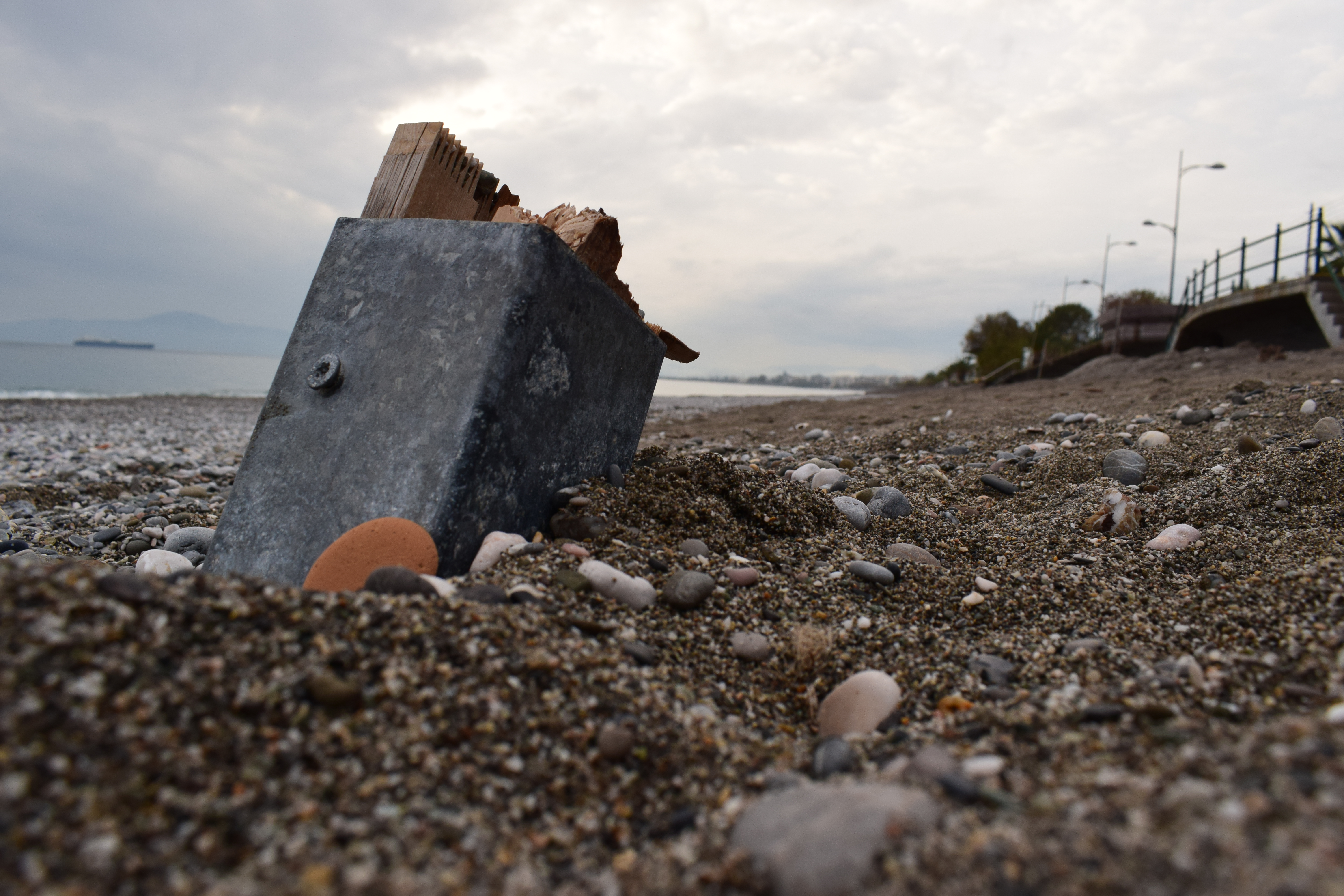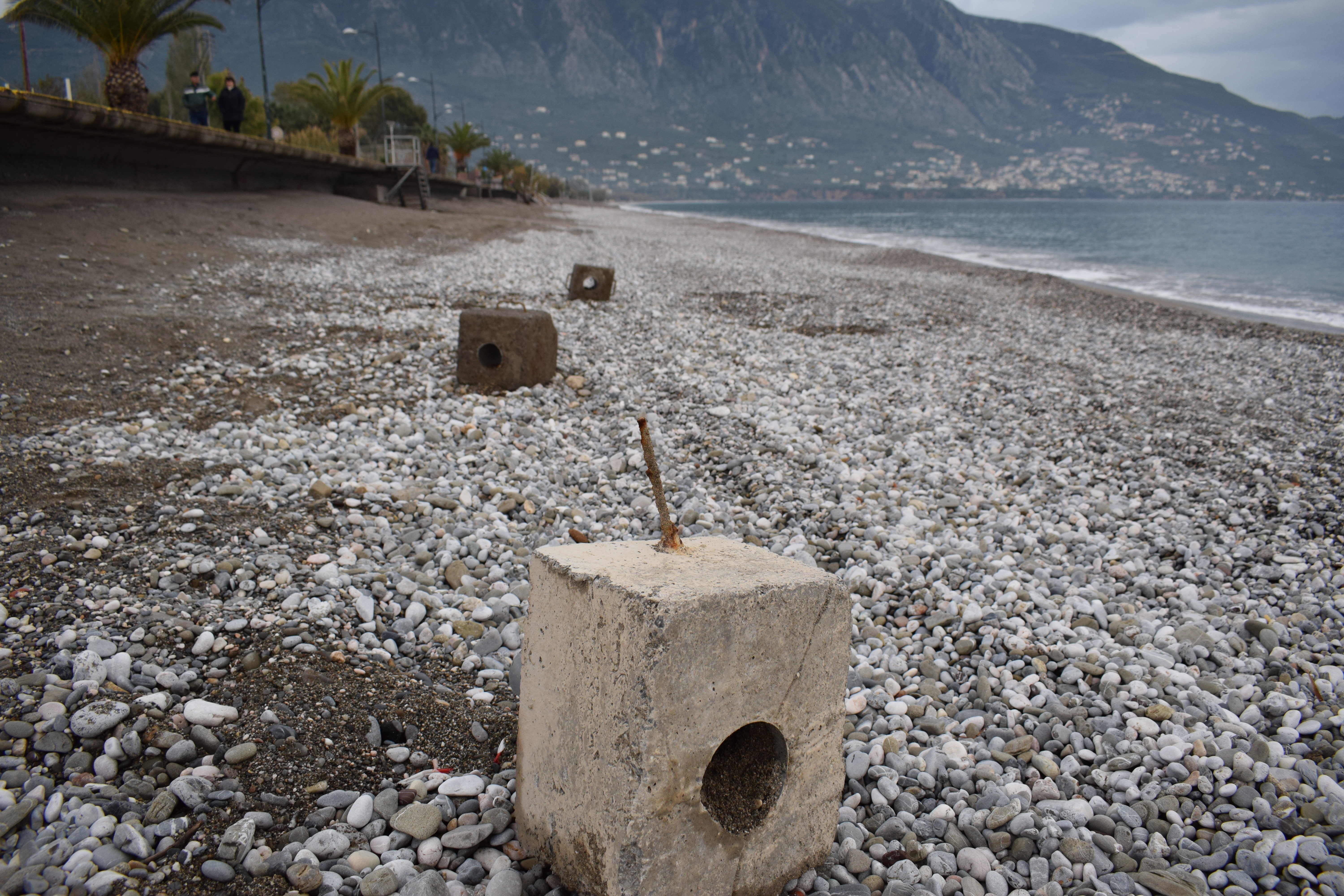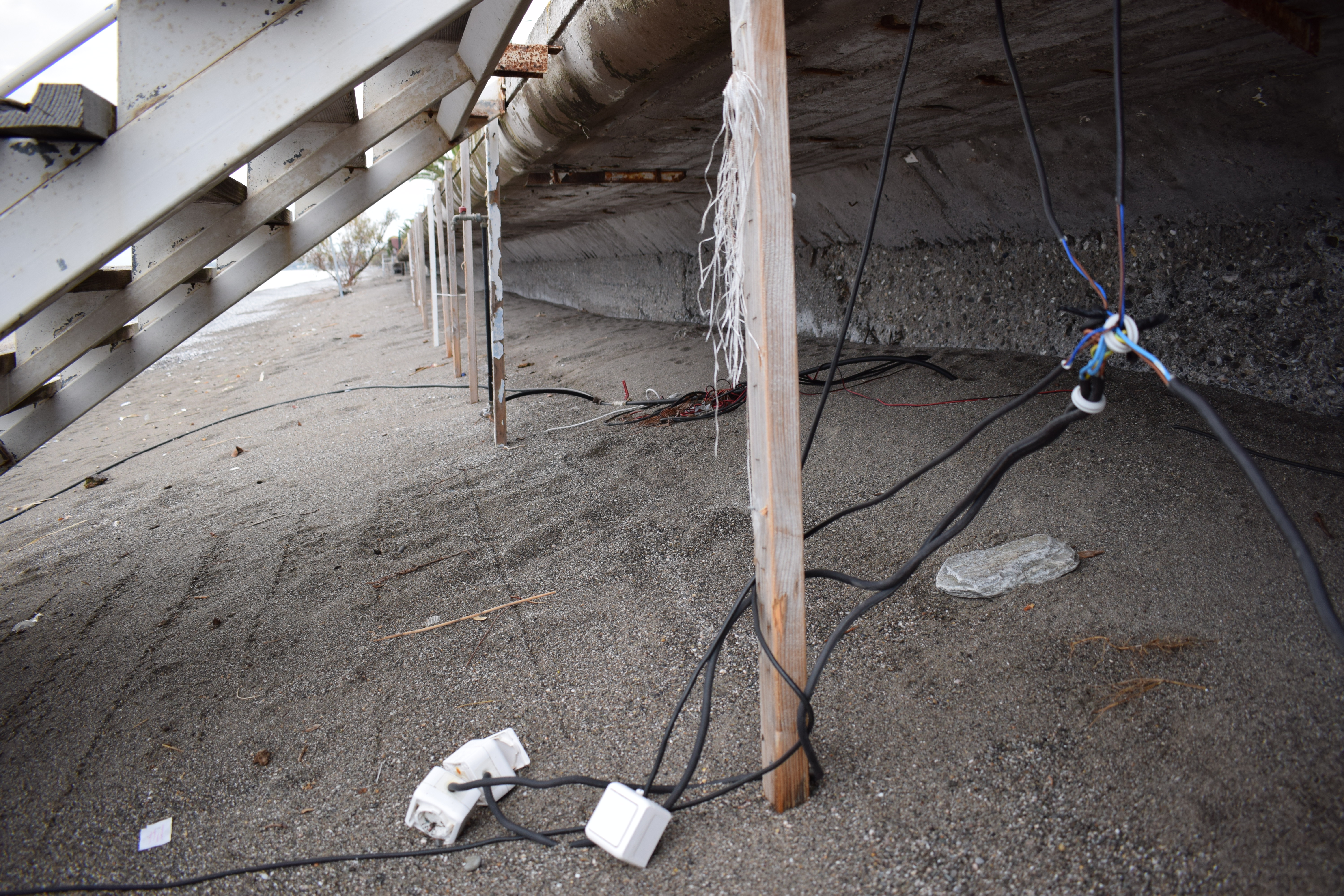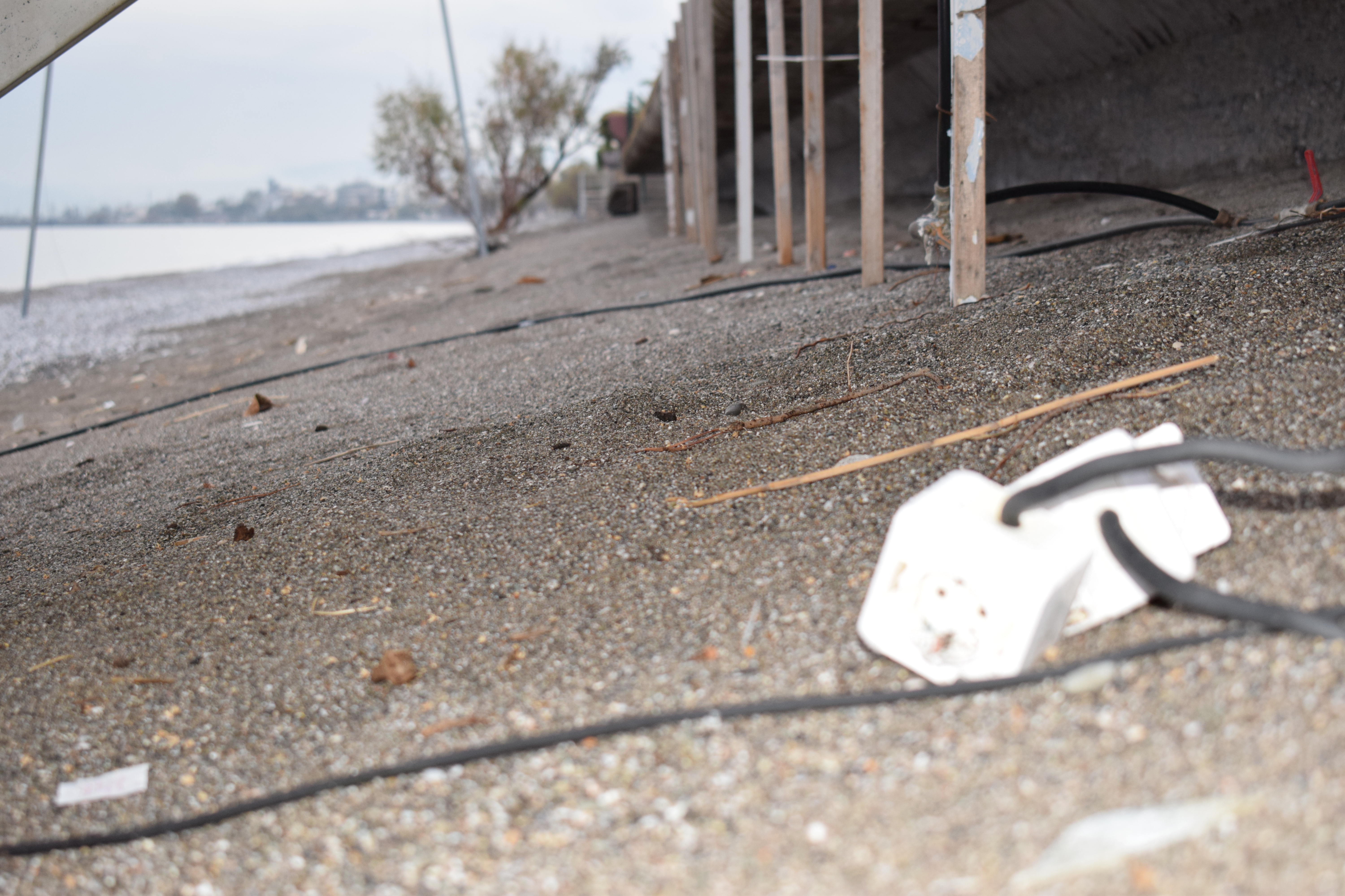Παράλληλα, στην ακτή υπάρχουν βάσεις από ομπρέλες, με επικίνδυνα σίδερα και ξύλα να προεξέχουν γύρω από αυτές, ενώ λίγα μέτρα πιο πέρα μπορεί να συναντήσει κανείς ξεχασμένα καλώδια και πρίζες.