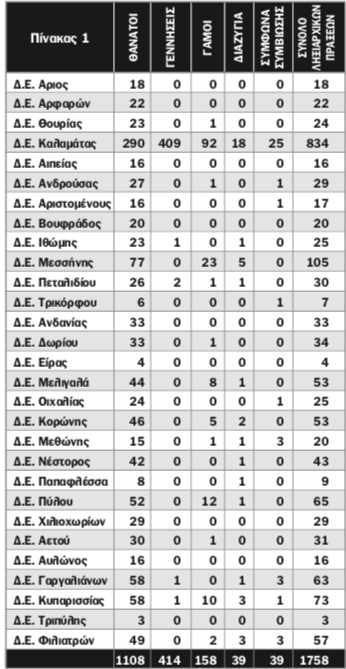 Αναλυτικά, τα δημογραφικά στοιχεία του πρώτου εξαμήνου του 2019 παρουσιάζονται στον πίνακα 1. Γεννήσεις καταγράφονται κυρίως στο Ληξιαρχείο της Καλαμάτας γιατί μόνο στη μεσσηνιακή πρωτεύουσα λειτουργούν μαιευτικές κλινικές (Νοσοκομείο και ιδιωτικές).