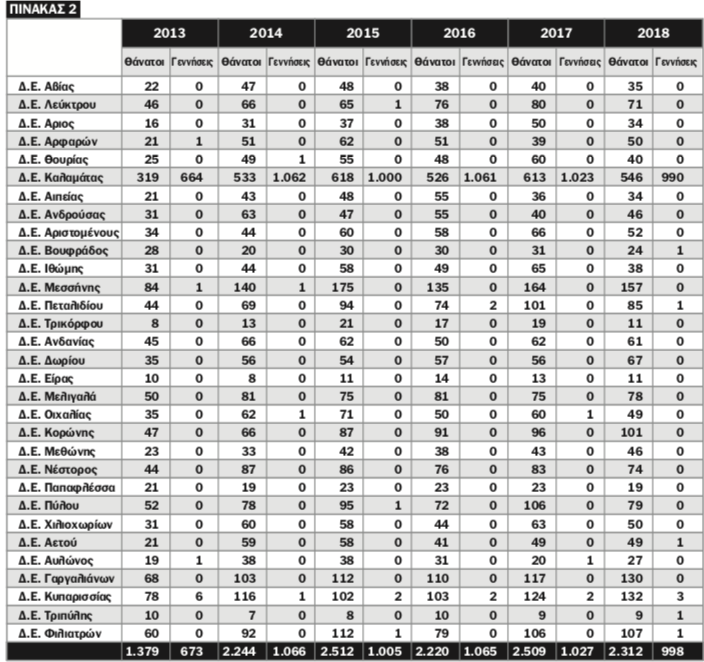 Στον πίνακα 2 παρουσιάζονται οι γεννήσεις και οι θάνατοι ανά έτος και δημοτική ενότητα από το 2013 μέχρι το 2018.