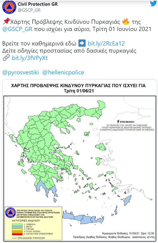 Την λίστα επικινδυνότητας για φωτιά την Τρίτη 01 Ιουνίου ανακοίνωσε η Πυροσβεστική Υπηρεσία σε σχετική ανάρτηση που έκανε. Στον σχετικό χάρτη περιλαμβάνονται έξι περιοχές της χώρας.