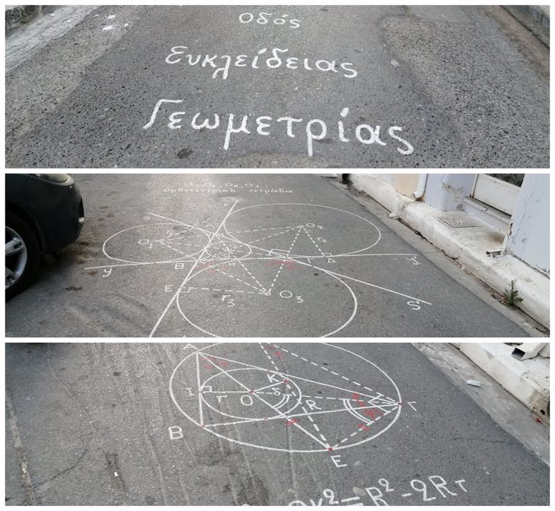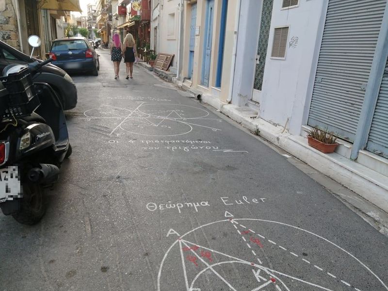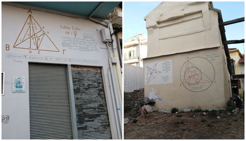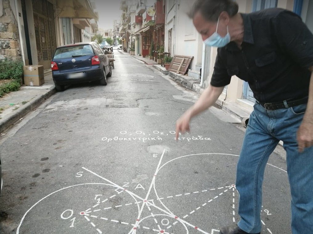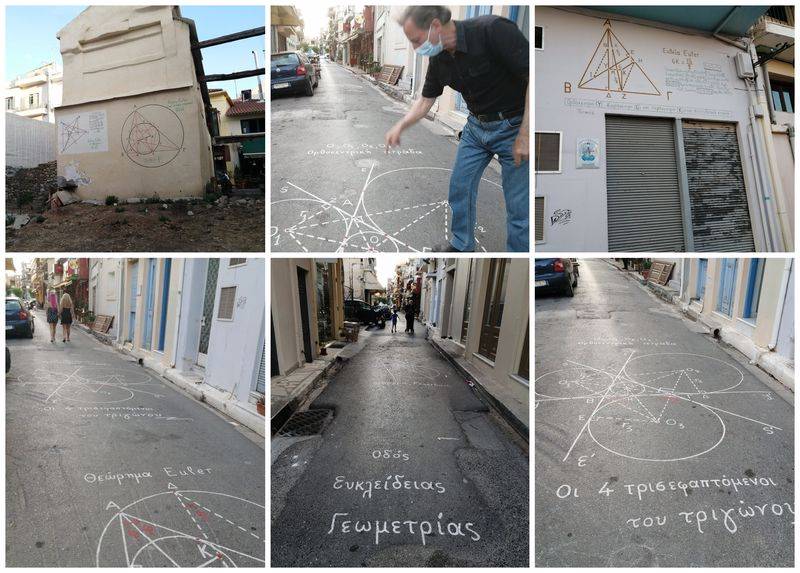 «Εχοντας παραπάνω ελεύθερο χρόνο λόγω της καραντίνας, απευθύνθηκα στον φίλο µου Γιώργο Μητρόπουλο, καθηγητή Πληροφορικής, ζητώντας του να µου δώσει κάποιες δύσκολες ασκήσεις για να τις λύσω. Εκείνος µε τη σειρά του µου τύπωσε ορισµένες από τον συγγραφέα Σπύρο Κανέλλο. Αποτέλεσµα αυτού ήταν η πρώτη που έλυσα, η ευθεία του Euler, να γίνει η ιδέα ώστε να τη µεταφέρω στον τοίχο του κτηρίου που διαµένω µε την βοήθεια µιας σκαλωσιάς. Στη συνέχεια ακολούθησε η ευθεία του Simson στη γειτονική Αµφείας, σε τοίχο απέναντι του σπιτιού µου ο κύκλος του Euler (των 9 σηµείων) για να καταλήξω να σχεδιάσω θεωρήµατα στο δρόµο, όπως του Feuerbach, του Μενελάου κ.ά. Για να ολοκληρώσω το εγχείρηµα αυτό χρησιµοποίησα πλαστικό χρώµα, µια σανίδα, έναν υποτυπώδη πήχη ουσιαστικά, ο δε διαβήτης µου ήταν και αυτός αυτοσχέδιος, κατόπιν κάποιων παρεµβάσεων που έκανα» σηµείωσε.
