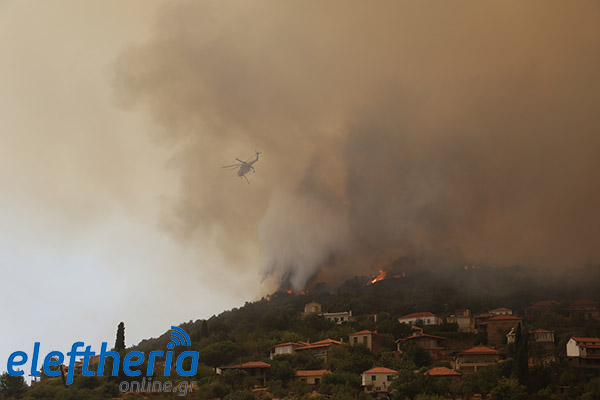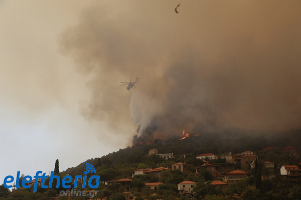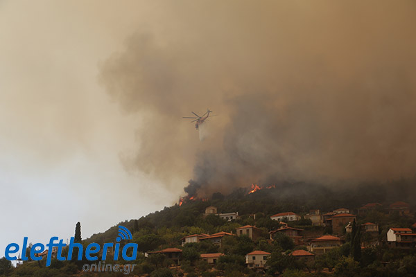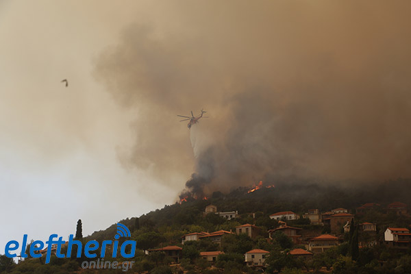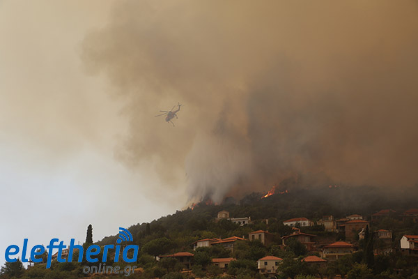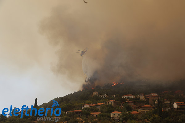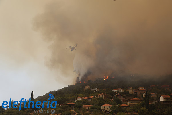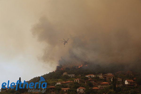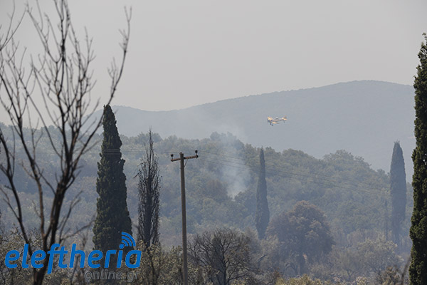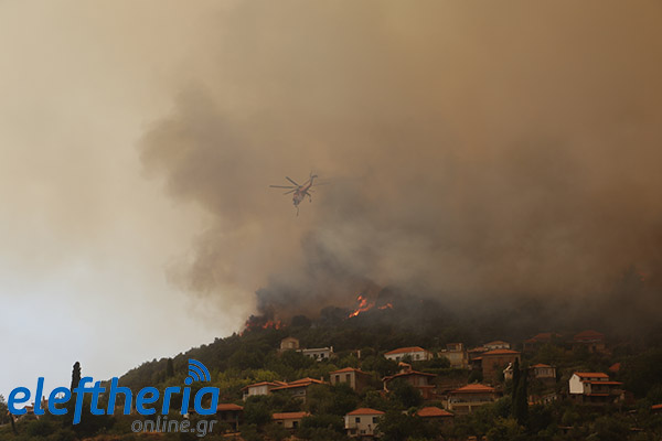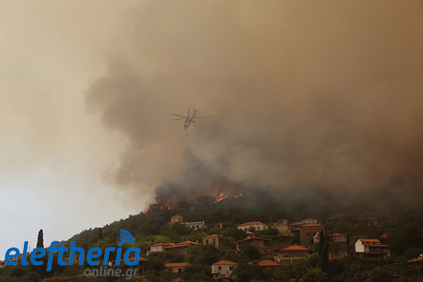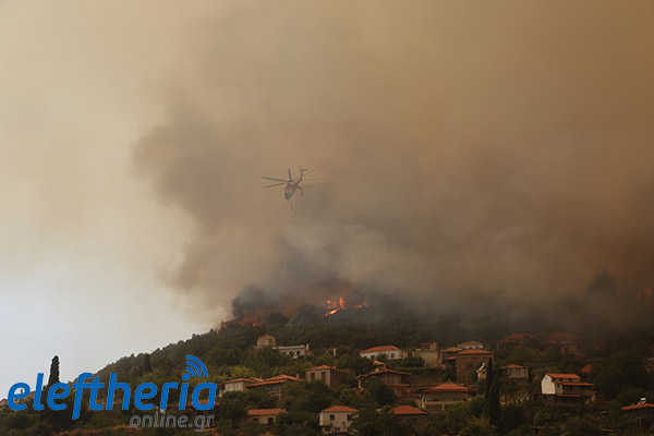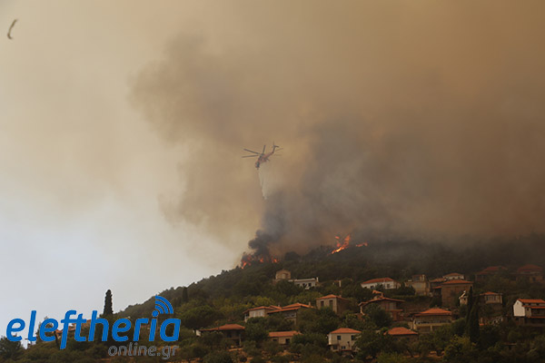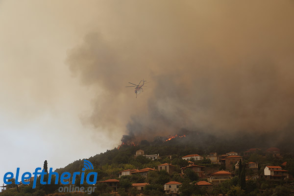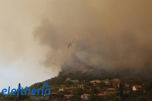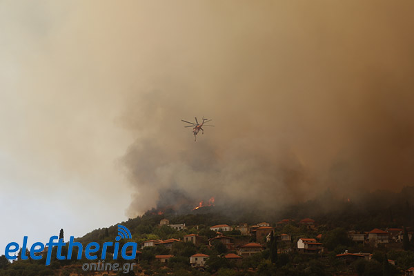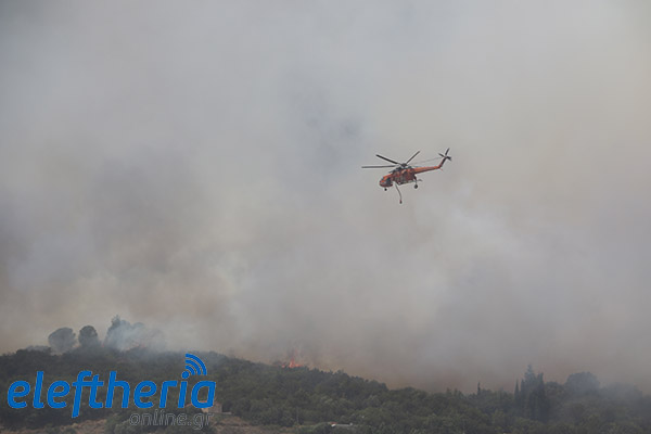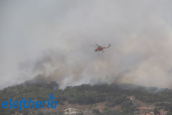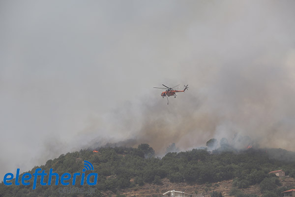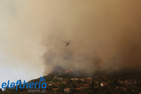 Νωρίτερα, την ώρα που το μεγάλο μέτωπο της φωτιάς κινείτο ακόμη απειλητικά προς το Καρνάσι, εμφανίστηκε ένα ελικόπτερο Erikson που έκανε ρίψεις για να περιορίσει τη φωτιά και να προστατεύσει το χωριό.