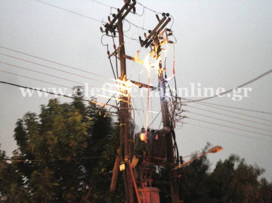 Τα φαινόμενα αναμένεται να συνεχιστούν και αύριο με τη θερμοκρασία να σκαρφαλώνει στους 30 βαθμούς. Στη φωτογραφία φάινεται εργαζόμενος της ΔΕΗ σκαρφαλωμένος σε μετασχηματιστή, όπου αποκαθιστά βλάβη στην οδό Αύρας στην Καλαμάτα, η οποία βύθισε στο σκοτάδι τη γύρω περιοχή.