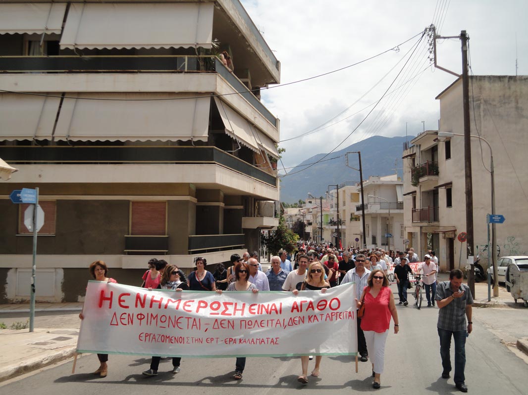 Επικεφαλής της κοινής πορείας τέθηκαν οι εργαζόμενοι της ΕΡΑ Καλαμάτας με πανό, με το οποίο ζητούσαν τη συνέχιση λειτουργίας των μέσων ενημέρωσης της ΕΡΤ. Νωρίτερα και στις δύο αρχικές συγκεντρώσεις αναγνώστηκε το ψήφισμα των εργαζομένων της ΕΡΑ από τους δημοσιογράφους Βαγγέλη Ποτέα και Μαρία Τομαρά.