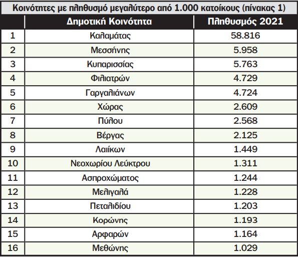 Από τις 280 συνολικά κοινότητες της Μεσσηνίας οι 118 (42%) έχουν λιγότερους από 100 κατοίκους, οι 180 (64%) λιγότερους από 200 κατοίκους και 244 (87%) λιγότερους από 500 μόνιμους κατοίκους. Περισσότερους από 1.000 κατοίκους (πίνακας 1) έχουν 16 οικισμοί της Μεσσηνίας. Μεγαλύτερη Κοινότητα είναι η Καλαμάτα με 58.816 κατοίκους και ακολουθούν η Μεσσήνη με 5.958, η Κυπαρισσία με 5.763, τα Φιλιατρά με 4.792 και οι Γαργαλιάνοι με 4.724 κατοίκους.