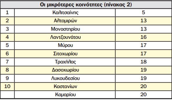 Οι μικρότερες κοινότητες της Μεσσηνίας (πίνακας 2) είναι η Καλίτσαινα με 5 κατοίκους, τα Αλτομιρά και το Μοναστήρι με 13 κατοίκους, το Λαντζουνάτο με 16 κατοίκους και το Μύρο με 17 κατοίκους.