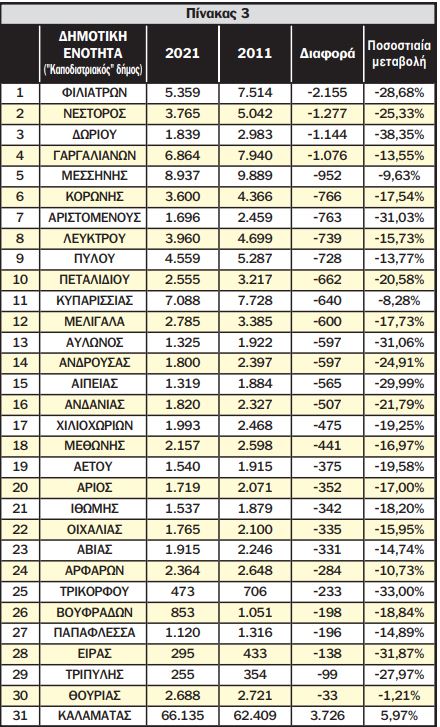 Ο μόνιμος πληθυσμός αυξήθηκε μόνο στη Δημοτική Ενότητα Καλαμάτας κατά 3.726 ενώ η μεγαλύτερη μείωση καταγράφηκε στη νοτιοδυτική Μεσσηνία, όπου συνολικά στις ενότητες Φιλιατρών, Γαργαλιάνων και Νέστορος το 2021 απογράφτηκαν 4.458 λιγότεροι κάτοικοι από όσους είχαν απογραφεί το 2011.