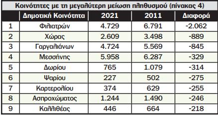 Στη Κοινότητα Φιλιατρών απογράφηκαν 2.062 λιγότεροι κάτοικοι, στην Κοινότητα Χώρας 889 λιγότεροι κάτοικοι στην Κοινότητα Γαργαλιάνων 845 λιγότεροι κάτοικοι και στην Κοινότητα Μεσσήνης 329 λιγότεροι κάτοικοι.