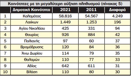 Η μοναδική αξιοσημείωτη αύξηση πληθυσμού (πίνακας 5) κατά 4.249 κατοίκους καταγράφηκε στην Κοινότητα Καλαμάτας. Μικρή αύξηση σημειώθηκε στα Λαίικα (196 περισσότεροι κάτοικοι), στον Άγιο Νικόλαο (94 περισσότεροι κάτοικοι) και στη Θουρία (42 περισσότεροι κάτοικοι)